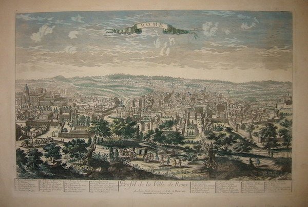 Incisione originale su rame (cm. 52,5x34,5 più ampi margini bianchi) pubblicata dall’editore Charpentier. Coloritura antica all’acquarello. Rara veduta a volo d’uccello della città di Roma presa dal Monte Gianicolo. Marigliani, n. 175.
