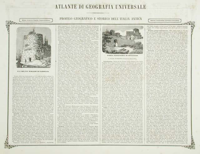 Tavola con due vignette, raffiguranti un nurago e la città di Ferentino. Testo relativo allla storia e geografia dell'Italia Antica
