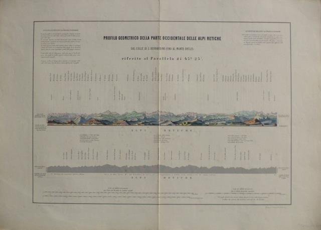Tratta dall' “Atlante Geografico dell'Italia”, Milano, Francesco Vallardi, 1880 circa. Litografia a doppia pagina (Litografia di Pietro Bertotti), colore d'epoca, cm 46,8 x 66,5 (la parte figurata) più margini. Tavola raffigurante il profilo geometrico della parte orientale delle Alpi Retiche, con estensione dal Colle di San Bernardino al Monte Ortles e in cui si distinguono le vette principali e le secondarie. Buon esemplare.