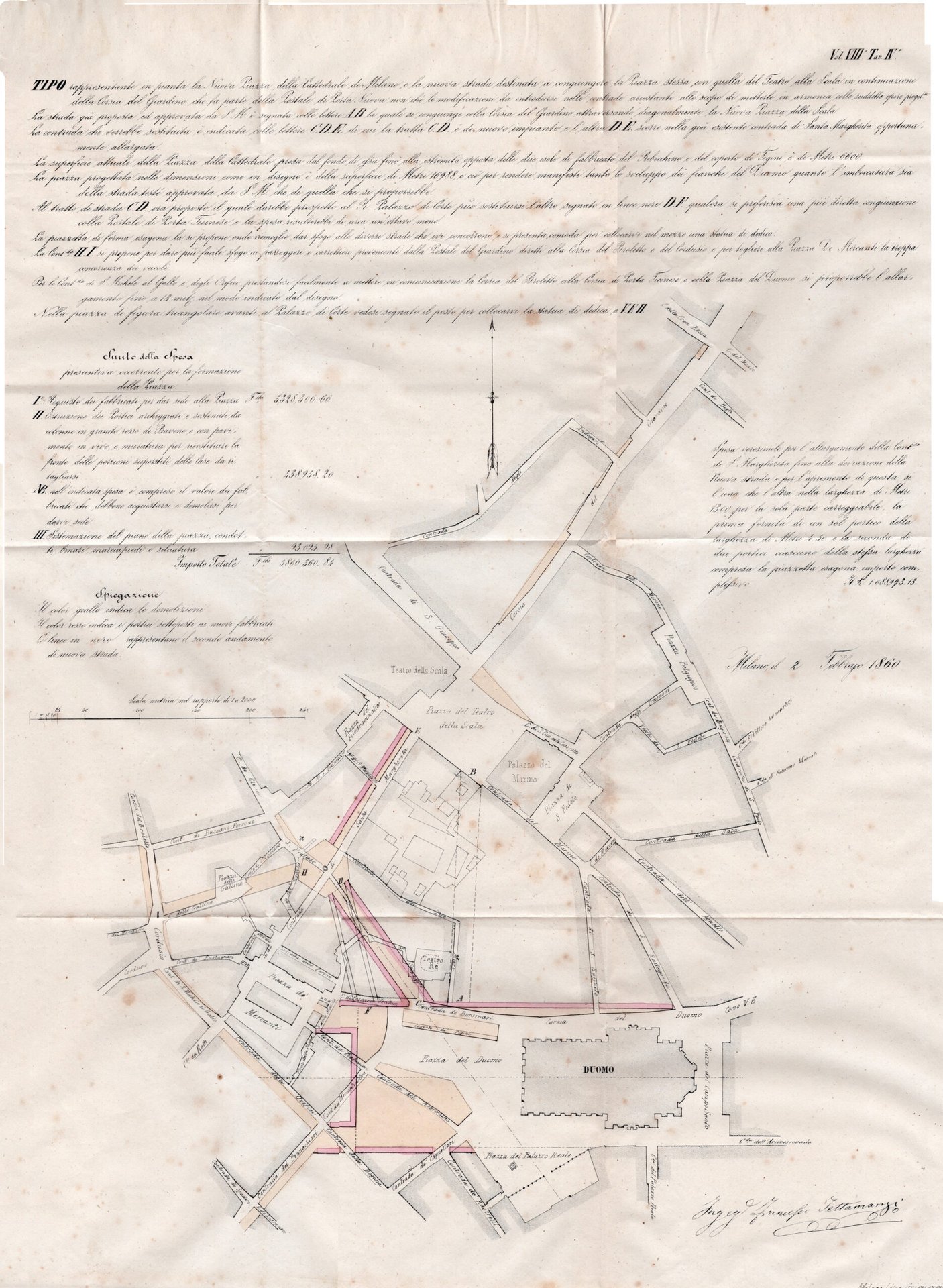 Alla realizzazione del progetto per l'ampliamento della piazza che fu realizzata da Giuseppe Mengoni concorsero moltissimi ingegneri che presentarono questo progetto. In vendita il progetto dell'ing. Ing. Tettamanzi marzo 1860.