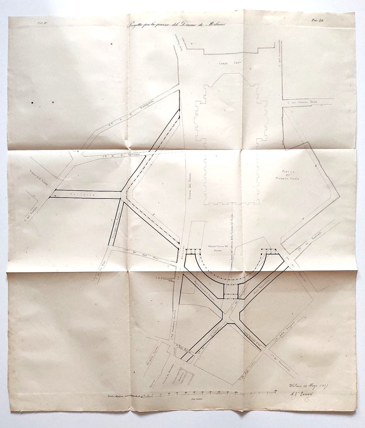 Una grande tavola della piazza del duomo e vie adiacenti di cm. 58 x50 e uno stralcio tratto dal Giornale dell'Ingegnere con la descrizione del progetto di 4 facciate, alcune lievi fioriture e segni del tempo.
