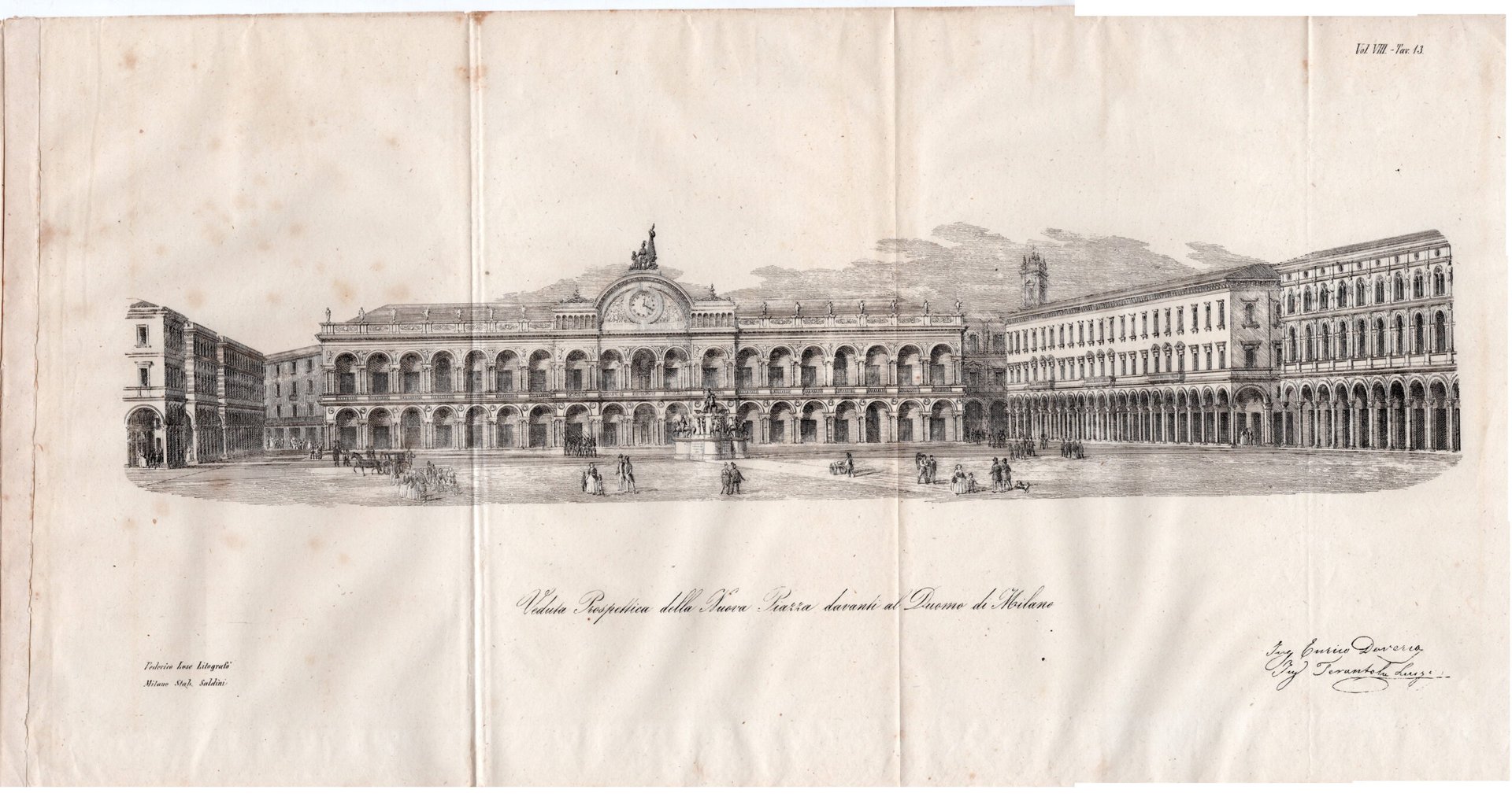 Alla realizzazione del progetto dell'ampiamento della piazza che fu realizzato da Giuseppe Mengoni concorsero motissimi ingegneri che presentarono il loro progetto tra cui gli ingegneri Enrico Daverio e Luigi Tarantola nel maggio 1860. Due grandi tavole di cui una bellissima veduta prospettica della nuova piazza davanti a Duomo di cm. 45 x 17 ed una tavola della planimetria della parte centrale di Milano col progetto della nuova piazza intorno al duomo e di sistemazione 52 x 68,5. Uno stralcio tratto dal Giornale dell'ingegnere architetto e agronomo di 6 facciate e uno stralcio di 13 facciate sui progetti edilizii presentati per Milano ed esposti nelle sale di Brera.