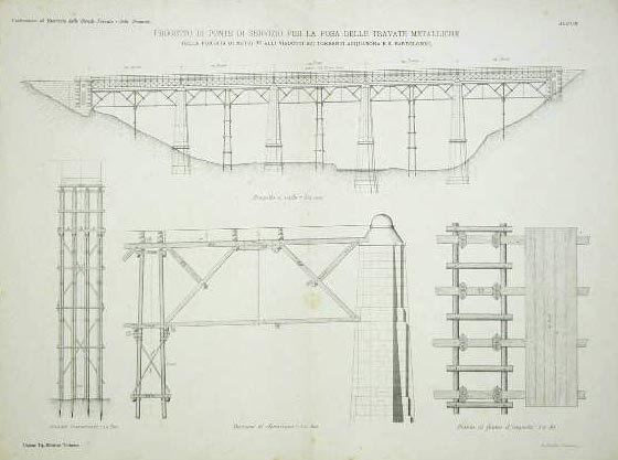 Prospetto del ponte di servizio per la costruzione dei viadotti S. Bartolomeo e Acquabona sulla linea Savona - Torino