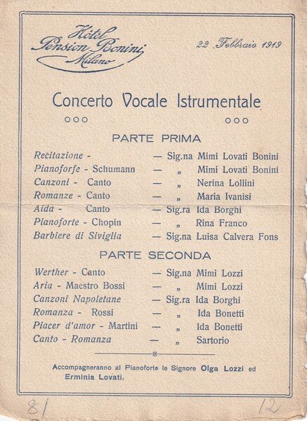 Programma"Concerto Vocale Istrumentale 1919" Hotel Pension BONINI - Milano