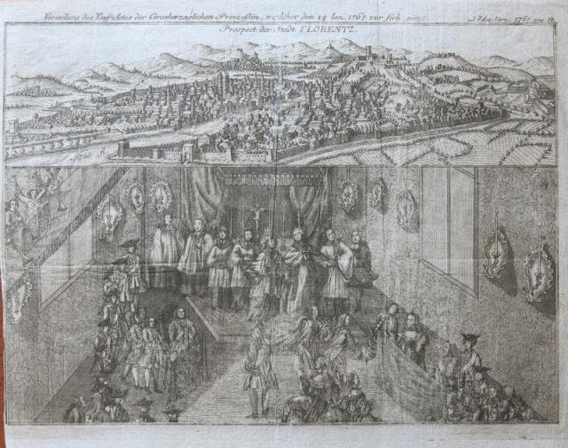 Prospect der stadt Florentz. Vorstellung des Tauf actus der grosherzoglichen prinzessin, weelker den 14 Ian. 1767. vor sich gieng (Prospetto della città di Firenza. Presentazione dell’Atto di Battesimo della Principessa Granducale, il 14 Ian. 1767).