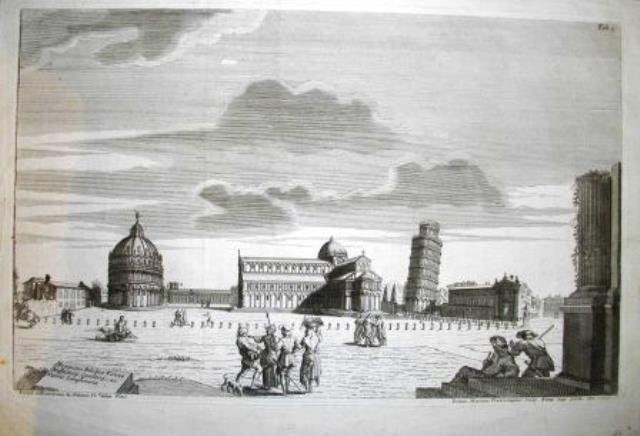 Dal “Theatrum Basilicae Pisanae”, incisione in rame all’acquaforte e bulino, b/n, cm 25,2 x 40 (alla lastra). [In bs. a sn.]: Ioseph. Et Franciscus de Milanis Fr. delin. Pisis; [in bs. a ds.]: Dominic. Marianus Franceschinius Sculp. Romae Sup. perm. An. 1705. Pubblicata in Martini Giuseppe, “Theatrum Basilicae Pisanae” (Roma, Antonio De Rossi, 1705). Bella veduta con il complesso di piazza dei Miracoli, animata da figure in primo piano. Ottimo esemplare in margini.