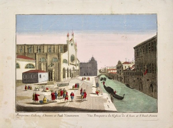 Incisione in rame, mm 287x410, dipinta d’epoca. Piacevole veduta della Chiesa di San Giovanni e Paolo. Le vedute remondiniane rappresentano a pieno merito la stampa popolare italiana: semplici nel tratto, quasi sempre colorate con poche tinte in maniera rapida e decisa, affascinano per la loro immediatezza e sono state oggetto di numerose mostre, raccolte e studi negli ultimi anni. Le incisioni preparate per essere inserite nel Mondo Nuovo, dove i popolani potevano vederle, illuminate dalla luce di candele messe dietro alle tavole e conoscere così le città del mondo. Buon esemplare seppur con aloni marginali e qualche piega. <BR><BR>