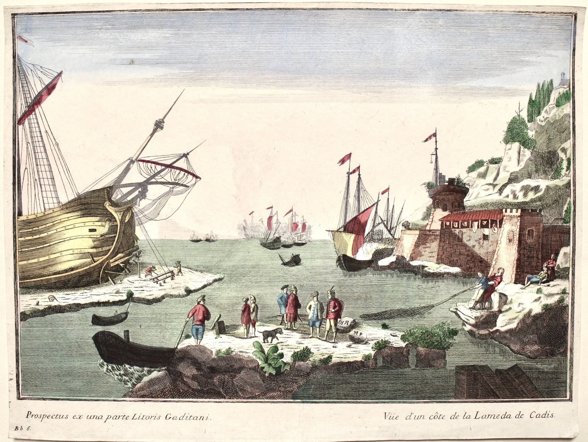 Incisione in rame dipinta d’epoca, mm 320x425. Bella veduta del litorale di Cadice con in primo piano una bella scena di navi e altre imbarcazioni a vela, personaggi e pescatori; nel consueto stile popolare tipico dei Remondini. Le vedute edite dai Remondini rappresentano a pieno merito la stampa popolare italiana: semplici nel tratto, colorate con poche tinte in maniera rapida e decisa, affascinano per la loro immediatezza e sono state oggetto di numerose mostre, raccolte e studi negli ultimi anni. Le vedute erano preparate per essere inserite nel Mondo Nuovo, dove i popolani potevano vederle illuminate e conoscere così le città del mondo. Ottimo esemplare con buoni margini in bella coloritura originale.