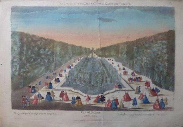 Paris, 1770 circa. Incisione in rame all'acquaforte, colore d'epoca, cm 31 x 45 (alla lastra). Veduta ottica in tenue coloritura. Usuali segni del tempo della carta.