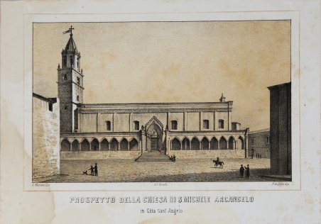 Veduta panoramica disegnata da S. Leale e P. Mattei, tratta da ' Il regno delle Due Sicilie descritto ed illustrato ovvero descrizione topografica, storica, monumentale, industriale, artistica economica e commerciale delle provincie poste al di qua e al di là del faro e di ogni paese di esse: Opera dedicata alla maestà di Ferdinando 2. / Antonio Racioppi; a cura di Filippo Cirelli. ' – Napoli: G. Nobile, 1853. L’opera, che iniziò a stamparsi nel 1853, restò incompiuta a causa della morte del suo curatore e della fine del reame napoletano. Il Regno descritto ed illustrato ripercorse e ampliò le linee di indagine che alcuni decenni prima avevano percorso già altri lavori e altri studiosi, come la Descrizione di Giuseppe Del Re o il Dizionario di Lorenzo Giustiniani. Il volume è corredato da numerose litografie. Egli intuì che “le tradizioni popolari sono elemento primario per chiarire e documentare la vita ed il processo spirituale di una terra”. Filippo Cirelli, figura poliedrica di inventore ed editore, elaborò una raffinata elaborazione della scoperta di Moritz Hermann Von Jacobi, la galvanoplastica, che ha come fine la riproduzione di disegni mediante matrici grafiche: ' ideò la «galvanotipia», o «elettrotipia», per la cui scoperta c’è l’encomio ed una speciale menzione da parte dell’Istituto di Francia, una citazione «con onore» nel ' Nuovo Dizionario Tecnologico, edito a Venezia, ci sono elogi da parte della stampa, anche estera, mentre «il Reale Istituto d’Incoraggiamento e la Consulta Generale del Regno di Napoli», scrive Pasquale Mastroianni, «proposero ed ottennero dal re, a favore del novello inventore, il privilegio di privativa della invenzione per dieci anni, tanti quanti richiesti dal Cirelli». A Cirelli è riconosciuta anche l’invenzione della “Litotipia” con cui si riproducevano, attraverso preparati chimici su pietra litografica, disegni già stampati. Cirelli si dedica anche all’attività editoriale: nel suo stabilimento poligrafico a Napoli cura la pubblicazione di opere rare e con un innegabile valore artistico, scientifico, letterario e storico. Stampa il ' Poliorama Pittoresco ' un’opera periodica con svariati argomenti con il pregio di rendere accessibile il sapere al popolo. L’opera che gli dà più lustro ' è Il Regno delle Due Sicilie descritto ed illustrato, una storia dell’umanità vista attraverso le tradizioni, le abitudini, gli usi e i costumi degli abitanti, «sussidiata» da re Ferdinando II. “Il primo marzo del 1853, l’editore e litografo Filippo Cirelli (1796-1867) diede alle stampe in Napoli il primo fascicolo del ' Il Regno delle Due Sicilie descritto e illustrato ' [.]: un ambizioso progetto editoriale a carattere scientifico-divulgativo articolato in saggi monografici su «tutt’i Comuni fin al più piccolo villaggio del Regno» […] ' Le litografie finora censite sono sessanta, aventi a soggetto cinquantuno città del regno ritratte, nella maggior parte dei casi, nella cornice naturalistica del paesaggio contermine. […] ' Contrariamente a quanto accadde per il ' Poliorama ' – nel quale le illustrazioni sono parte integrante del testo – nel ' Il Regno delle Due Sicilie descritto e illustrato, Cirelli decise di distribuire le iconografie (litografie a colori su carta pregiata) separatamente dai fascicoli. In questo modo, risolse i problemi di impaginazione e di stampa delle illustrazioni nel testo – impostato su due colonne e impresso ad un colore – e incentivò la diffusione e la vendita dell’Opera miscellanea attraverso una tecnica di marketing che rimanda sorprendentemente alla più recente moda dei gadget. Queste scelte editoriali così innovatrici per l’epoca però, comportano una più complessa ricomposizione ex post dell’intera Opera: le cartografie, le corografie, i quadri sinottici, le vedute, i disegni di architettura e di costume – vista la mancata conclusione della pubblicazione – non sono stati riuniti c. Panoramic view drawn by Stefano Leale and P. Mattei, taken from: Il regno delle Due Sicilie descritto ed illustrato ovvero descrizione topografica, storica, monumentale, industriale, artistica economica e commerciale delle provincie poste al qua e al di là del faro e di ogni paese di esse: Opera dedicata alla maestà di Ferdinando 2. / Antonio Racioppi; a cura di Filippo Cirelli. - Naples: G. Nobile, 1853. The work, which began to be printed in 1853, remained unfinished due to the death of its editor and the end of the Neapolitan kingdom. The Kingdom described and illustrated retraced and expanded the lines of investigation that some decades earlier had already covered other works and other scholars, such as the Description of Giuseppe Del Re or the Dictionary of Lorenzo Giustiniani. The volume is accompanied by numerous lithographs. He sensed that “popular traditions are a primary element to clarify and document the life and spiritual process of a land”. ' Lithograph, some spotting but generally in good conditions. Rare. Cfr.