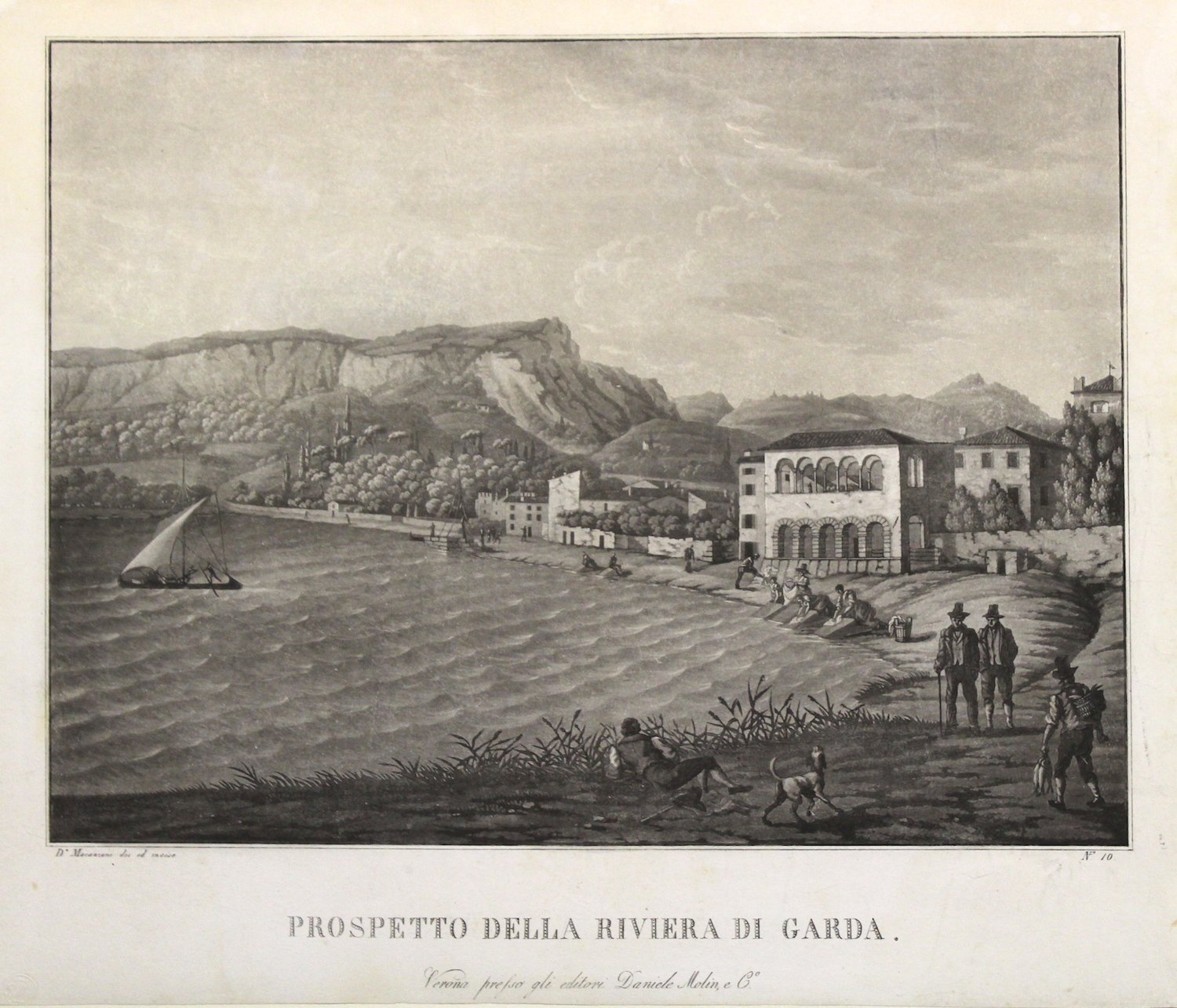 Acquatinta, mm 350x410 (lastra), incisa su proprio soggetto da Macanzoni, noto pittore veronese (1803-1873) figlio d'arte, che fu autore di importanti dipinti di genere vedutistico; da questi fu tratta l'importante serie di 12 stampe, dalla quale è tratta la presente. Questa serie di vedute si può considerare pari per importanza e rarità alla più celebre serie di Wetzel, precedente ma senza dubbio meno rara.<BR>Macanzoni fu avviato dal padre Lodovico, anche lui pittore, al vedutismo. <BR>La sua attività fu piuttosto limitata in quanto egli si dedicò particolarmente al restauro di antichi dipinti, cfr. "Il Garda nelle stampe". Splendido esemplare rifilato alla battuta della lastra<BR>