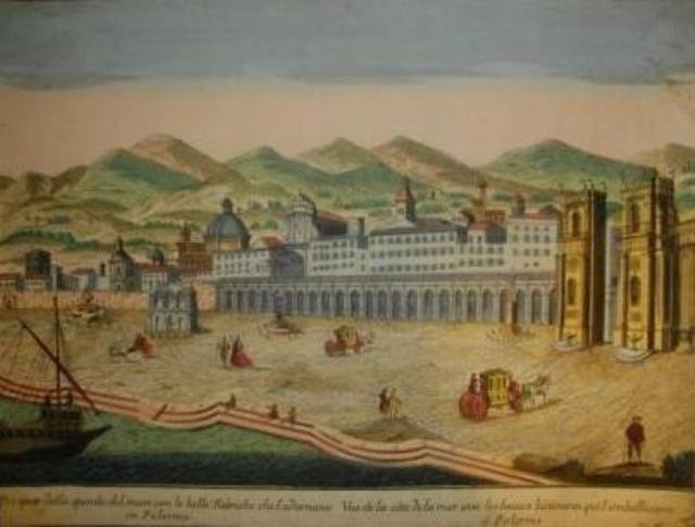 Prospetto della sponda del mare con le belle Fabriche che l’adornano in Palermo – Vue de la cote de la mer avec les beaux batiments qui l’embellissent à Palerme. Remondini.
