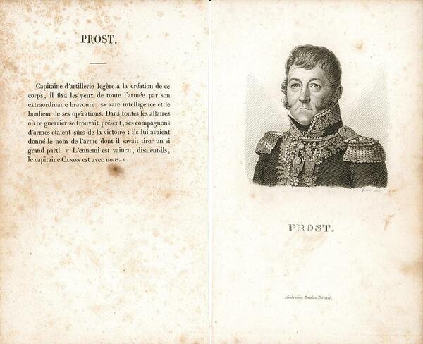 Ritratto del personaggio distintosi nelle vittorie e conquiste militari francesi tra il 1792 e 1815. L'incisione, antica ed originale, è accompagnata da pagina con testo descrittivo del personaggio. Foxing