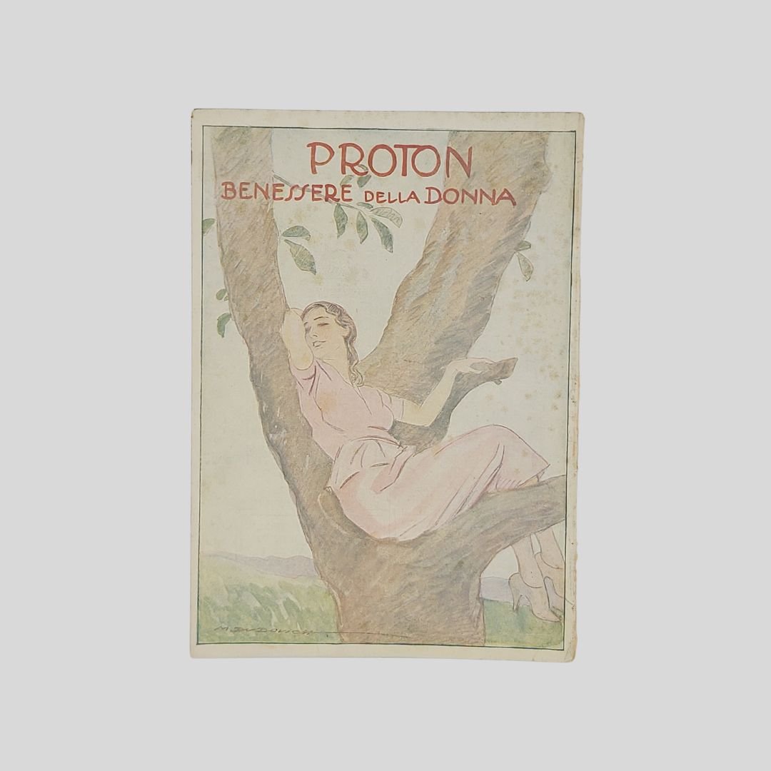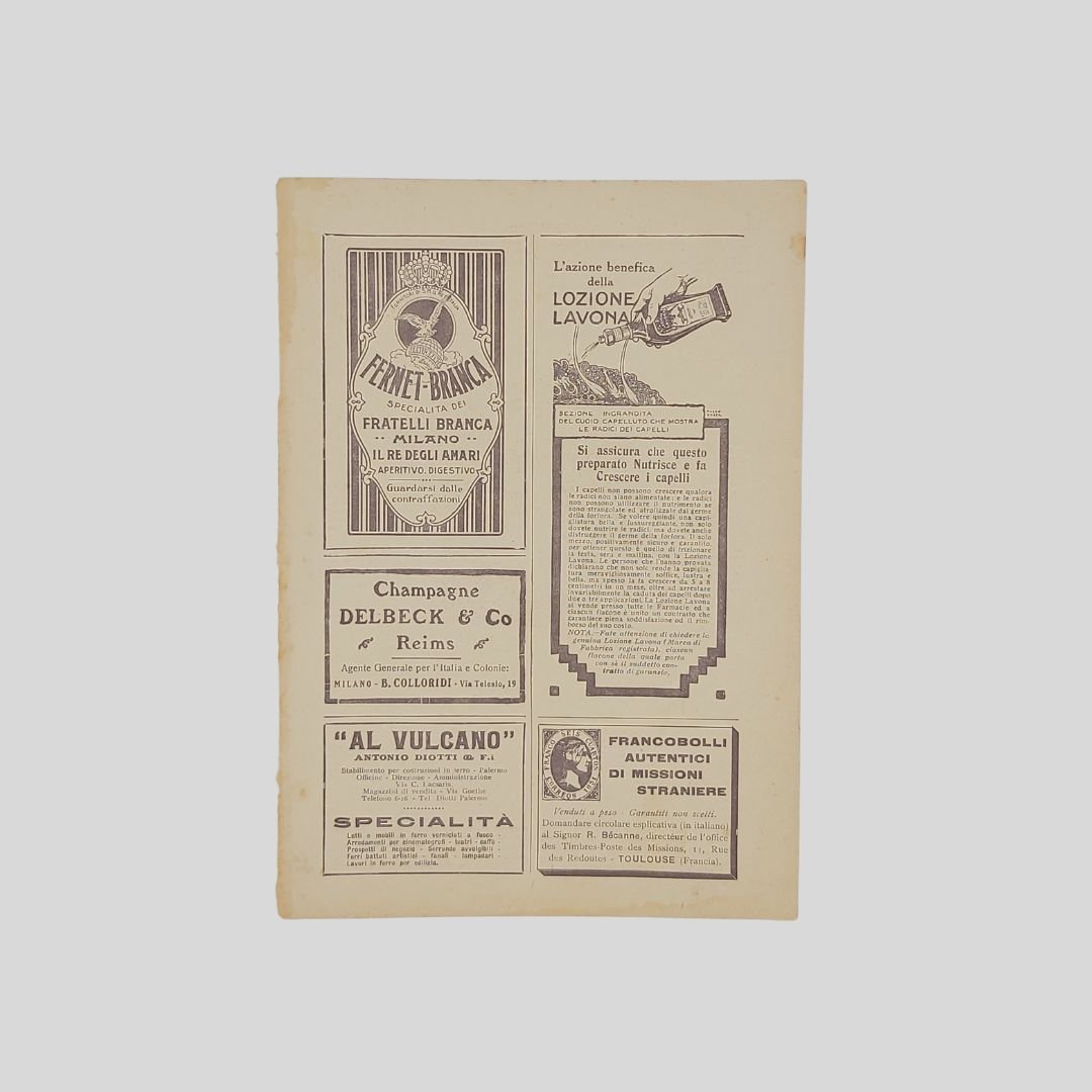 cm 17×24. Copertina originale, tratta da rivista d’epoca, di Marcello Dudovich. Stampata al recto-verso. Alcune fioriture, ma in buone condizioni. Al verso pubblicità Fernet-Branca, Lozione Lovona, Champagne Delbeck & Co. etc.
