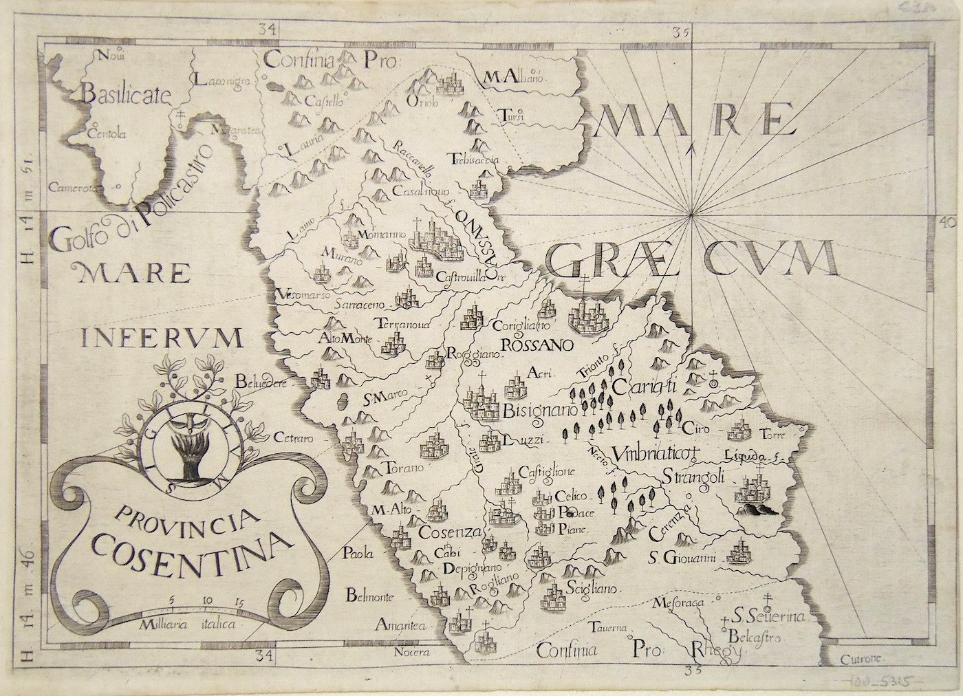 Incisione in rame, 235x335. Raffigura il territorio fra Lagonegro in Basilicata e S. Severina. Tratta da “Chorographica descriptio provinciarum et conventuum F.F. Minorum S. Francisci Capucinorum…” altrimenti detto “Atlante dei Cappuccini”. Ben conservato ma con margini di pochi mm. oltre la battuta del rame e rifilata entro la battuta del rame al margine destro. Accompagnata dal foglio complementare che elenca il numero di religiosi cappuccini, di conventi dell’ordine ecc.