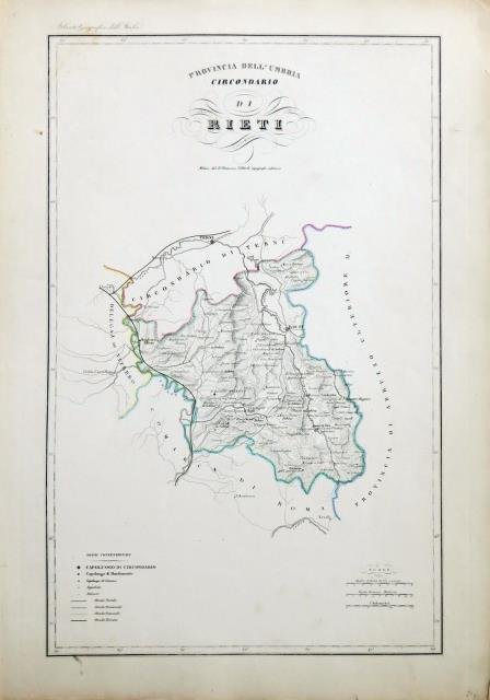 Tratta dall' “Atlante Geografico dell'Italia” Milano, Francesco Vallardi, 1880 circa. Incisione, b/n (confini in colore d'epoca), cm 33,5 x 52,5 (la parte figurata) più margini. In bs. a sn. i principali segni convenzionali. Carta come di consueto leggermente ingiallita ma buon esemplare.