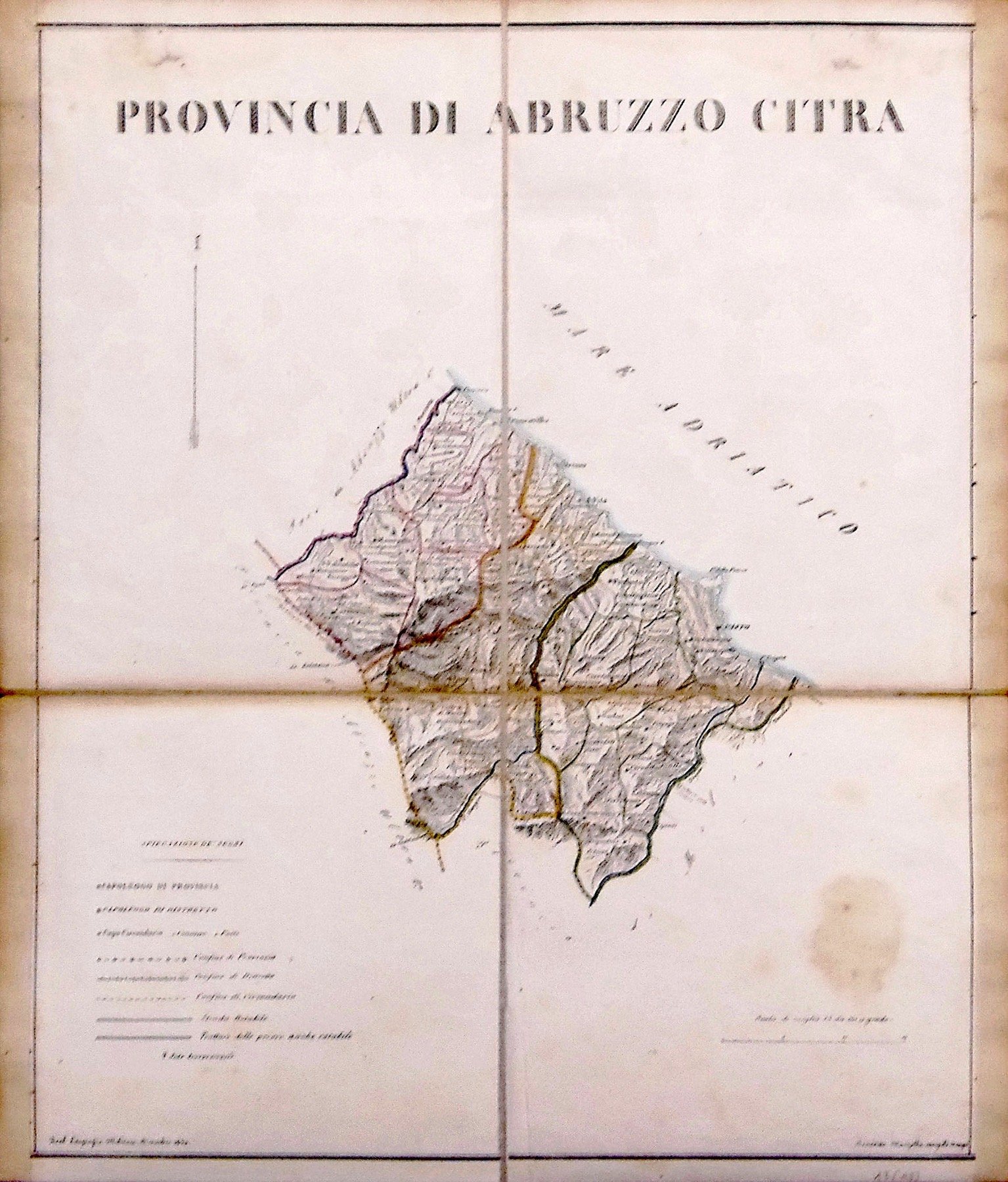 Litografia, dipinta d'epoca, 410x340. Tratta da : "Atlante Corografico. del Regno delle Due Sicilie." Qualche saltuaria leggera fioritura ed alone lieve; tagliata in quattro segmenti applicati su tela per essere piegata. Ben conservata complessivamente anche se mancante delle colonne laterali che riportano i dati statistici.