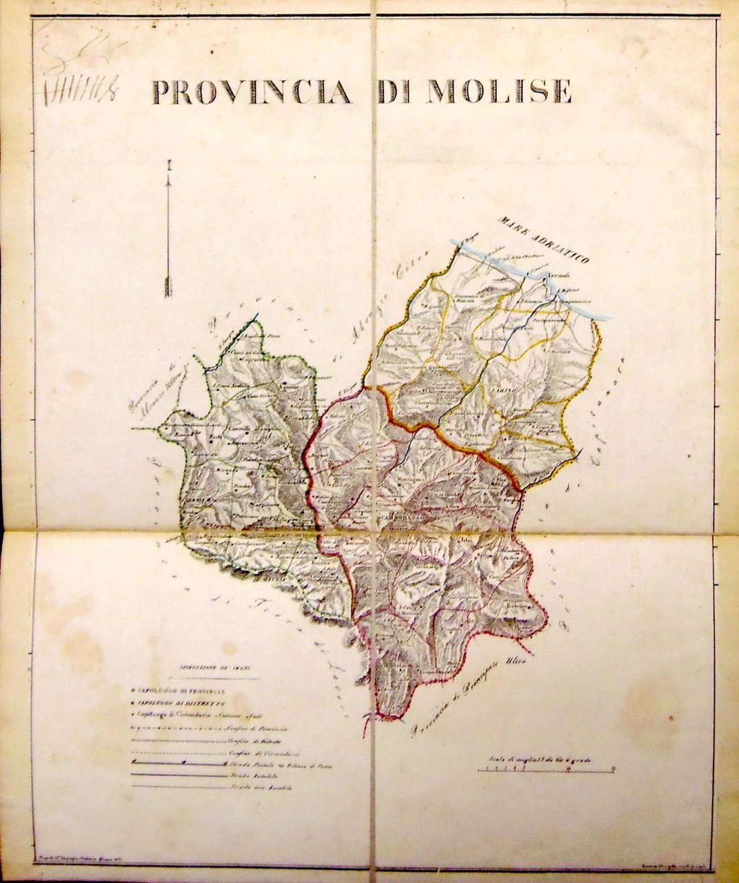 Litografia, dipinta d'epoca, 410x330. Tratta da : "Atlante Corografico. del Regno delle Due Sicilie." Qualche saltuaria leggera fioritura ed alone lieve; tagliata in quattro segmenti applicati su tela per essere piegata. Ben conservata complessivamente anche se mancante delle colonne laterali che riportano i dati statistici.