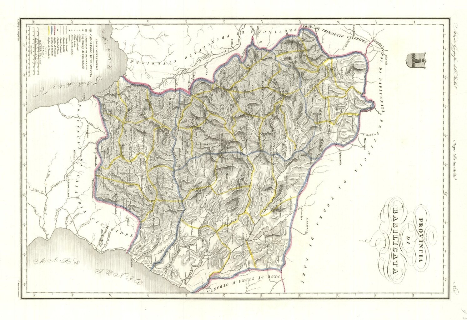 Carta geografica, antica ed originale, con rappresentazione della divisione territoriale della provincia di Potenza con evidenziati i territori nei dintorni di Melfi, Palazzo, Bionero, Avigliano, Matera, Tricarico, Trevigno, Montemurro, Pisticci, Saponara, Santarcangelo, Lagonero, Chiaromonte. Inserita nel II volume dell'opera "Atlante Geografico degli Stati Italiani delineato sopra le migliori e più moderne mappe per servire di corredo alla Corografia Fisica Storica e Statistica dell'Italia" contenente le carte dell'Italia Inferiore. Descritta da Attilio Zuccagni-Orlandini, edita e stampata a Firenze nel 1844-45. Autore: Zuccagni - Orlandini edit. & G.Maina e V.Stanghi inc. Luogo: Basilicata. Anno: 1844. Tecnica: incisione in rame. Dimensioni: 516x335 mm. L'incisione è caratterizzata da una coloritura coeva ai confini