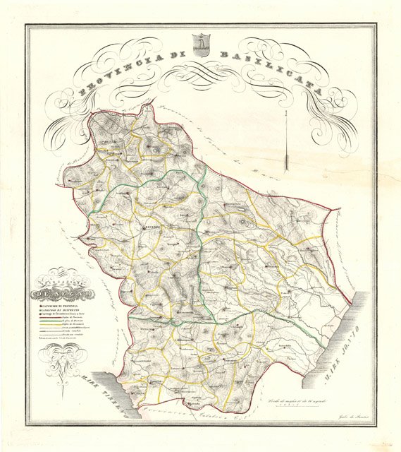 Carta geografica della Basilicata, confini colorati all'epoca. Restauro per strappo nel lato destro