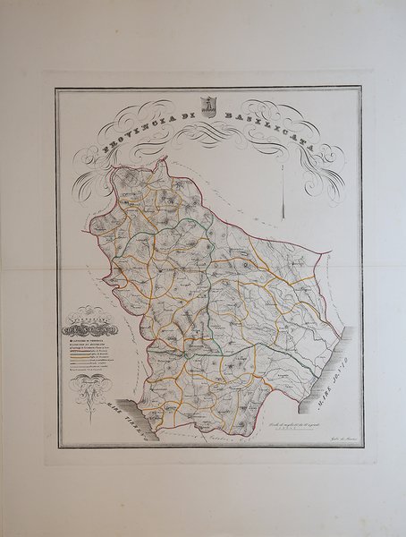 Carta geografica della Provincia di Basilicata ' tratta dall’Atlante Corografico del Regno delle Due Sicilie, edito a Napoli in tre ristampe dal 1840 al 1856. L’Atlante Corografico, come consuetudine all’epoca, uscì a dispense. Venne anche stampato un ' Manifesto di Associazione ' (probabilmente nel 1843) allo scopo di raccogliere sottoscrizioni per l’opera, nel quale era descritto il contenuto dell’opera, le carte già realizzate e il relativo costo. Nel prospetto erano previste anche due tavole con la “Posizione astronomica, topografica e geodesia, popolazione e divisione amministrativa…” che non furono mai realizzate. Il materiale che utilizzò per la compilazione era costituito dai due atlanti, anteriori, realizzati da Benedetto Marzolla e da Luigi De Salvatori. Di fatto, De Sanctis non era né geografo né topografo, e il suo atlante è anzitutto un’opera di compilazione. Le tavole, prive di reticolo geografico, sono veri e propri esercizi di grafica e calligrafica, che fanno dell’opera uno dei più raffinati atlanti del secolo. Inoltre, riflettono il suo interesse per i dati statistici. Ogni tavola è adornata con lo stemma della provincia rappresentata. Incisione in rame, coloritura coeva dei contorni, in ottime condizioni. Map taken from “Atlante Corografico del Regno delle Due Sicilie” published in Naples, three editions from 1840 to 1856. The Atlante Corografico, as usual at the time, came out in a single parts. It was also printed a poster of Association, (probably in 1843) in order to collect subscriptions for the work, in which he had described the content of the work, the cards have already been completed and the relevant cost. Copper engraving, contemporary coloring of the edges, in good condition. Cfr.