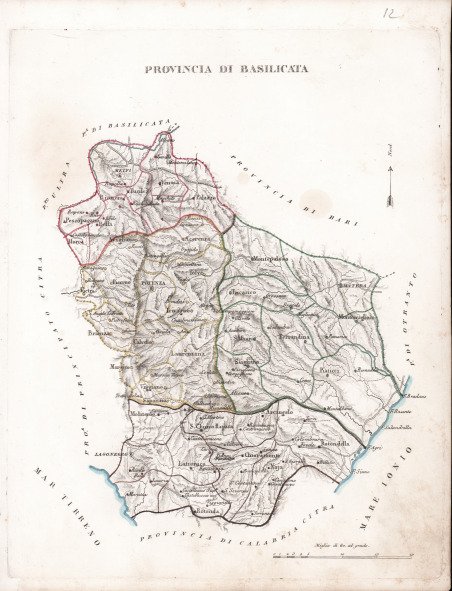 Rarissima carta geografica tratta dall’Atlante Corografico, Statistico, Storico, ed Idrografico del Regno delle Due Sicilie Diviso ne Domini al di qua ed al di la del Faro ' di Giuseppe Bifezzi, stampato a Napoli, Tipografia alla Sibilla, 1836-1845. Si tratta dell’edizione definitiva dell’importane rilievo del geografo calabrese Giuseppe Bifezzi, dedicato alla parte peninsulare del Regno di Napoli. Accanto ' all’Atlante corografico del Regno delle due Sicilie ' di Benedetto Marzolla, questo lavoro costituisce senza dubbio una delle più significative descrizioni regionali del Regno di Napoli della prima metà dell’Ottocento. L'opera uscì a Napoli tra il 1836 e il 1845 in 15 dispense, ciascuna composta di testo e tavole ed è assai rara. Nel 1837 era uscito il ' Nuovo atlante corografico, statistico, storico, ed idrografico del Regno delle Due Sicilie ' che anticipava questa pubblicazione con l’edizione delle sole 18 carte geografiche. Il progetto prevedeva anche una seconda parte riguardante la Sicilia che non fu mai realizzata. Le 15 dispense, ciascuna con frontespizio proprio, riguardano: I. ' Provincia di Napoli, 1843. II. ' Provincia di Terra di lavoro, 1841. III. ' Provincia di Principato citeriore, 1841. IV. ' Basilicata,1843. V. ' Principato ulteriore,1836. VI. ' Capitanata, 1842. VII. ' Terra di Bari, 1839. ' VIII. ' Terra di Otranto, 1841. ' IX. ' Calabria citeriore, 1836. X. ' Calabria ulteriore II, 1839. XI. ' Calabria ulteriore I, 1839. XII. ' Contado di Molise, 1842. XIII. ' Abruzzo citeriore, 1837. XIV. ' Abruzzo ultra secondo, ' 1838. XV. ' Abruzzo ulteriore primo, 1841. Il volume è illustrato da una carta geografica generale del Regno di Napoli, 2 tavole con raffigurati i laghi principali del Regno, 15 carte geografiche con i confini acquerellati, corrispondenti alle 15 province, 16 vedute: Napoli, Caserta, Capua, Salerno, Potenza, Avellino, Foggia, Bari, Lecce, Cosenza, Catanzaro, Reggio Calabria, Campobasso, Chieti, Aquila, Teramo e 16 tavole di costumi delle diverse province. Le vedute e i costumi sono litografie di Giuseppe D’Onofrio da disegni di Francesco Wenzel. Giuseppe Bifezzi, inventore e cartografo calabrese, era nato il 12 settembre del 1798 a Serra San Bruno. Ingegnere, geografo, litografo, capitano dell’esercito borbonico, componente del Real Officio Topografico, inventore di uno strumento per la misurazione delle distanze - il telegometro – che, ancor più che l’opera geografica e cartografica, fu decisivo per consolidare la fama di Bifezzi tra i suoi contemporanei. Della sua invenzione Bifezzi aveva fornito accurati ragguagli in una pubblicazione in-folio, corredata da disegni illustrativi, stampata a Napoli nel 1848 presso la Real Tipografia Militare, che si apriva con una Memoria dell’autore sul suo lavoro. L’invenzione del telegometro nasceva, secondo l’esordio della predetta Memoria, dalla consapevolezza che se la misura delle distanze orizzontali risultava essenziale nei rilievi topografici, altrettanto “difficile, lungo, ed inesatto” era il metodo del tempo per ottenerla. Il telegometro, come ricorda anche la scheda dell’Istituto Geografico Militare che ne ospita a Firenze nel Museo degli strumenti un esemplare, comparve nella Grande Esposizione di Londra, promossa dalla Royal Society of Arts, nel 1862 e venne presentato successivamente pure nell’Esposizione internazionale marittima di Napoli del 1871, insieme con due altri congegni (il telescopometro e il pantelemetro). Acquaforte, coloritura coeva dei contorni, minime fioriture della carta, in ottimo stato di conservazione. Bibliografia: V. Valerio, ' Atlanti napoletani del XIX sec. (1808-1869), scheda 25, pp. 92-94; Cremonini, 316. Very rare map from the ' Atlante Corografico, Statistico, Storico, ed Idrografico del Regno delle Due Sicilie Diviso ne Domini al di qua ed al di la del Faro ' by Giuseppe Bifezzi, printed in Naples, Tipografia alla Sibilla, 1836-1845. This is the definitive edition of Calabrian geographer Giuseppe Bifezzi's important survey of the peninsular part of the Kingdom of Naples. Next to Benedetto Marzolla's ' Chorographic Atlas of the Kingdom of the Two Sicilies, this work undoubtedly constitutes one of the most significant regional descriptions of the Kingdom of Naples in the first half of the 19th century. The work came out in Naples between 1836 and 1845 in 15 dispensations, each consisting of text and plates, and is very rare. In 1837 the ' Nuovo atlante corografico, statistico, storico, ed idrografico del Regno delle Due Sicilie ' had come out, anticipating this publication by publishing only 18 maps. The project also included a second part concerning Sicily, which was never realized. The volume is illustrated by a general map of the Kingdom of Naples, 2 plates depicting the main lakes of the Kingdom, 15 maps with watercolor borders, corresponding to the 15 provinces, 16 views: Naples, Caserta, Capua, Salerno, Potenza, Avellino, Foggia, Bari, Lecce, Cosenza, Catanzaro, Reggio Calabria, Campobasso, Chieti, Aquila, Teramo, and 16 plates of costumes of the different provinces. The views and costumes are lithographs by Giuseppe D'Onofrio from drawings by Francesco Wenzel. ' Giuseppe Bifezzi, Calabrian inventor and cartographer, was born Sept. 12, 1798, in Serra San Bruno. Engineer, geographer, lithographer, captain in the Borboni army, member of the ' Royal Topographical Office, inventor of an instrument for measuring distances-the telegometer-that, even more than his geographic and cartographic work, was decisive in consolidating Bifezzi's fame among his contemporaries. Of his invention Bifezzi had provided accurate details in an in-folio publication, accompanied by illustrative drawings, printed in Naples in 1848 at the Real Tipografia Militare, which opened with a Memoir by the author on his work. The invention of the telegometer stemmed, according to the beginning of the aforementioned Memoir, from the realization that while the measur