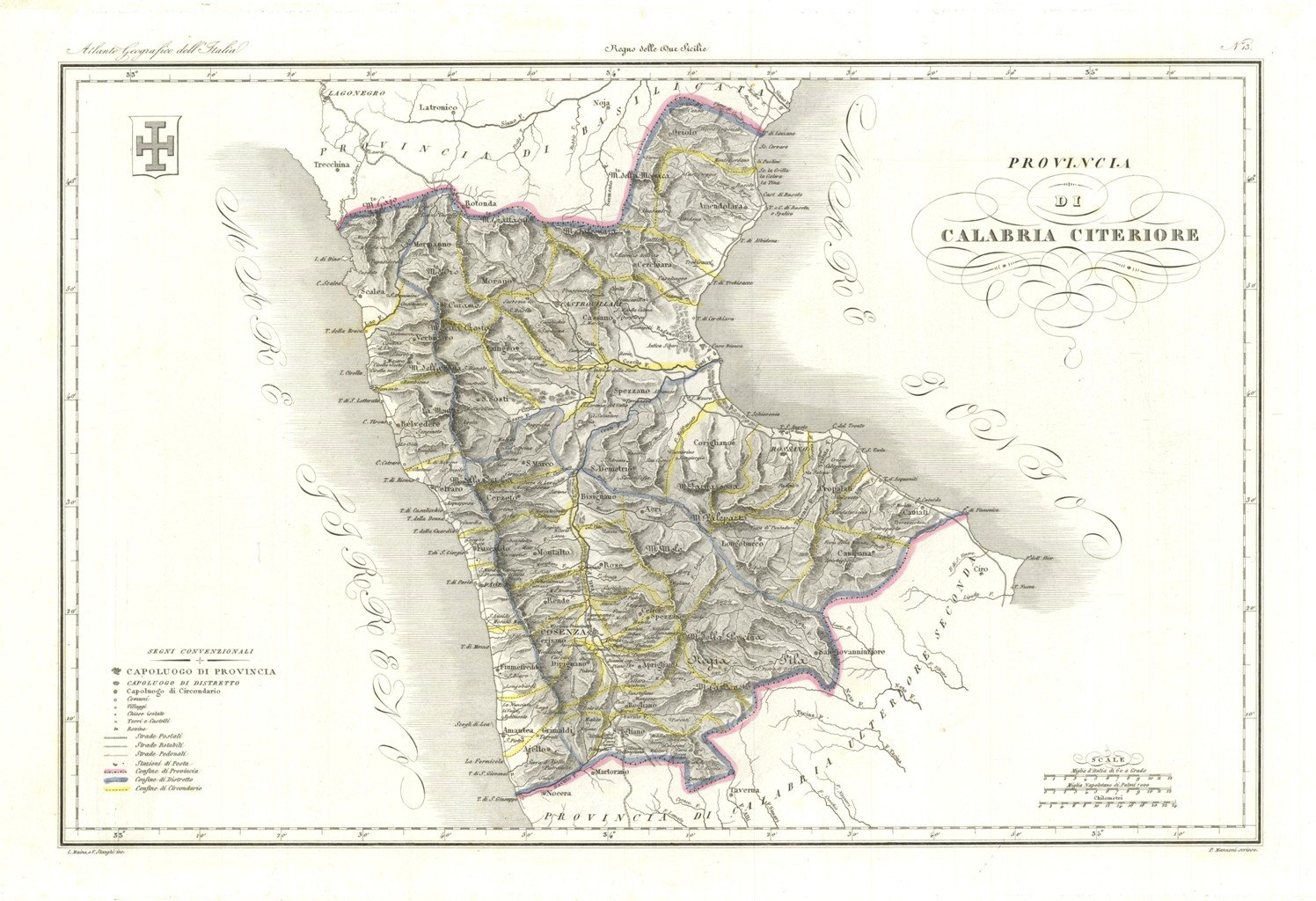 Carta geografica, antica ed originale, con rappresentazione della divisione territoriale della provincia di Cosenza con evidenziati i territori nei dintorni di Oriolo, Amendolara, Mormanno, Morano, Castrovillari, Lungro, Spezzano, Belvedere Marittimo, Cetraro, Cerzeto, Bisignano, Corigliano, Rossano, Longobucco, Cropalati, Caviati, Sangiovanninfiore, Amantea, Ajello, Grimaldi, Rogliano. Inserita nel II volume dell'opera "Atlante Geografico degli Stati Italiani delineato sopra le migliori e più moderne mappe per servire di corredo alla Corografia Fisica Storica e Statistica dell'Italia" contenente le carte dell'Italia Inferiore. Descritta da Attilio Zuccagni-Orlandini, edita e stampata a Firenze nel 1844-45. Autore: Zuccagni - Orlandini edit. & G.Maina e V.Stanghi inc. Luogo: Calabria. Anno: 1844. Tecnica: incisione in rame. Dimensioni: 339x522 mm. L'incisione è caratterizzata da una coloritura coeva ai confini