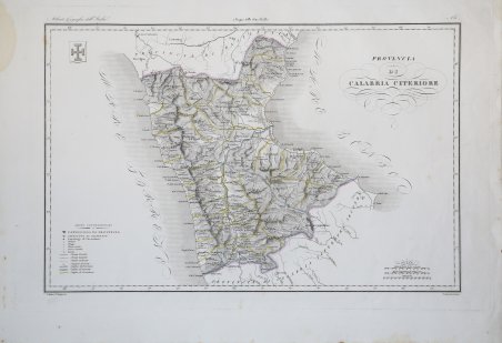 Carta geografica tratta dallâAtlante geografico degli Stati italiani delineato sopra le migliori e più moderne mappe per servire di corredo alla corografia fisica storica e statistica dell'Italia, di Attilio Zuccagni Orlandini stampato a Firenze, presso gli editori, 1844. In 2° massimo, 2 voll. Il primo volume contenente le carte dellâItalia Superiore in 52 fogli, il secondo volume quelle dellâItalia Inferiore in 77 fogli. Attilio Zuccagni Orlandini (1784-1872) nacque a Fiesole con il nome di Giuseppe Orlandini. In seguito allâadozione da parte del facoltoso zio materno Attilio Zuccagni (1754-1807), botanico e georgofilo, assunse il nome di Attilio Zuccagni Orlandini. La sua più importante opera è la relazione geografico-cartografica di tutti gli Stati preunitari italiani, la grandiosa Corografia fisica, storica e statistica dellâItalia e delle sue Isole (Firenze 1835-1845), in dodici volumi per diciannove tomi, con un volume introduttivo sullâintera penisola italiana. Lâopera costituì la summa delle centinaia di opere geografiche generali, regionali e locali allora disponibili e presentava, per ogni Stato preunitario, la trattazione fisica, storica, topografica e un inquadramento statistico. Nel 1844-45, la Corografia fu arricchita con cinque volumi di cartografie, vedute e altre illustrazioni di luoghi e monumenti: Atlante geografico degli Stati italiani delineato sopra le migliori e più moderne mappe (due volumi con 144 tavole inclusa la grande carta della penisola in 15 fogli) e Atlante illustrativo ossia raccolta dei principali monumenti italiani antichi, del medio evo e moderni e di alcune vedute pittoriche (tre volumi con 413 illustrazioni, stampate su 269 fogli). Le tavole furono incise, sempre a Firenze, in due apposite officine, da quattro valenti artisti lombardi (Vittorio Angeli, Giacinto Maina, Pietro Manzoni e Giuseppe Pozzi). Soprattutto il primo dei due atlanti rappresenta, ancora oggi, una pietra miliare nella storia della cartografia e dellâiconografia geografica italiana. Fu veramente âunâardua impresaâ, dal momento che spesso mancavano ancora (come, ad esempio, per il Ducato di Lucca e lo Stato Pontificio) prodotti cartografici compiutamente geometrici. I due prodotti furono presentati ai Georgofili nel 1843 e nel 1844, insieme alla mappa della Repubblica di San Marino. Lâopera si rivelò oltremodo costosa e non ottenne il successo commerciale sperato, ma servì da base per tante altre iniziative editoriali successive che vi attinsero, talora senza neppure rispettarne i diritti dâautore. Incisione in rame, coloritura coeva dei contorni, lievi ossidazioni, per il resto in ottimo stato di conservazione. Bibliografia Cfr. Anna Guarducci - Dizionario Biografico degli Italiani - Volume 100 (2020).