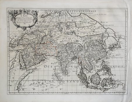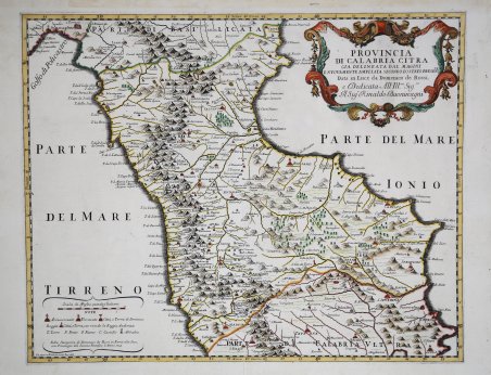 Carta geografica tratta dal ' Mercurio geografico overo Guida Geografica in tutte le parti del Mondo conforme le Tavole Geografiche del Sansone Baudran de Cantelli Data in luce con direttione, e cura di Gio. Giacomo de Rossi nella sua stamperia raccolta di carte edita a Roma tra il 1660 ed il 1730 dalla tipografia De Rossi ' ' - la datazione delle carte va dal 1669 al 1715 - la cui prima stesura si deve a Giovanni Giacomo de Rossi. Nel corso degli anni l’atlante fu arricchito da un numero sempre maggiore di carte nelle successive edizioni curate prima da Domenico de Rossi e poi dal figlio Filippo. Il ' Mercurio Geografico ' è una raccolta che raccoglie lavori di cartografi quali Michele Antonio Baudrand, Nicolas Sanson, Augustin Lubin, Filippo Titi, Giacomo Ameti, Giovanni Antonio Magini e Innocenzo Mattei e che contempla come "corpus" principale la grande produzione del geografo Giacomo Cantelli da Vignola. Le carte sono finemente copiate ed intagliate dai maggiori incisori dell'epoca tra i quali Falda, Widman, Barbey, Widman, Lhuillier, Donia, Mariotti. La carta deriva dall’opera di Giovanni Antonio Magini, pubblicata nel 1620 nel primo atlante sulle regioni italiane. Incisa da Gaspare Pietrasanta per Domenico De Rossi nel 1714, la mappa è una delle tavole aggiunte che compaiono solo nelle edizioni più tarde del Mercurio geografico. Incisione in rame, finemente colorata a mano, in ottimo stato di conservazione. Bibliografia cfr. R. Almagià, Studi storici di cartografia napoletana, in “Archivio storico per le province napoletane”, 38 (1913), p. 645; A. Bonazzi, Il Mercurio geografico: il gioco e la differenza, in “Giacomo Cantelli: geografo del Serenissimo”, Bologna, 1995, p. 37-44 e 150-152; Bagrow 268; Phillips I 254-255; Shirley BL I, pp. 868-874. Map taken from ' Mercurio geografico overo Guida Geografica in tutte le parti del Mondo conforme le Tavole Geografiche del Sansone Baudran de Cantelli Data in luce con direttione, e cura di Gio. ' Giacomo de Rossi nella sua stamperia ' collection of maps published in Rome between 1660 and 1730 by the typography De Rossi - the date of the maps goes from 1669 to 1715 - whose first edition is due to Giovanni Giacomo de Rossi. Over the years the atlas was enriched by an increasing number of maps in subsequent editions edited first by Domenico de Rossi and then by his son Filippo. The ' Mercurio Geografico ' is a collection that brings together works by cartographers such as Michele Antonio Baudrand, Nicolas Sanson, Augustin Lubin, Filippo Titi, Giacomo Ameti, Giovanni Antonio Magini and Innocenzo Mattei, and which includes as its main "corpus" the great production of the geographer Giacomo Cantelli da Vignola. The maps are finely copied and engraved by the major engravers of the time including Falda, Widman, Barbey, Widman, Lhuillier, Donia, Mariotti. ' The map is derived from the work of Giovanni Antonio Magini. Copper engraving, fine later hand colouring, in good condition. Bibliografia cfr. R. Almagià, ' Studi storici di cartografia napoletana, in “Archivio storico per le province napoletane”, 38 (1913), p. 645; A. Bonazzi, ' Il Mercurio geografico: il gioco e la differenza, in “Giacomo Cantelli: geografo del Serenissimo”, Bologna, 1995, p. 37-44 e 150-152; Bagrow 268; Phillips I 254-255; Shirley BL I, pp. 868-874. Cfr.