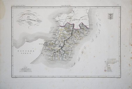 Carta geografica tratta dallâAtlante geografico degli Stati italiani delineato sopra le migliori e più moderne mappe per servire di corredo alla corografia fisica storica e statistica dell'Italia, di Attilio Zuccagni Orlandini stampato a Firenze, presso gli editori, 1844. In 2° massimo, 2 voll. Il primo volume contenente le carte dellâItalia Superiore in 52 fogli, il secondo volume quelle dellâItalia Inferiore in 77 fogli. Attilio Zuccagni Orlandini (1784-1872) nacque a Fiesole con il nome di Giuseppe Orlandini. In seguito allâadozione da parte del facoltoso zio materno Attilio Zuccagni (1754-1807), botanico e georgofilo, assunse il nome di Attilio Zuccagni Orlandini. La sua più importante opera è la relazione geografico-cartografica di tutti gli Stati preunitari italiani, la grandiosa Corografia fisica, storica e statistica dellâItalia e delle sue Isole (Firenze 1835-1845), in dodici volumi per diciannove tomi, con un volume introduttivo sullâintera penisola italiana. Lâopera costituì la summa delle centinaia di opere geografiche generali, regionali e locali allora disponibili e presentava, per ogni Stato preunitario, la trattazione fisica, storica, topografica e un inquadramento statistico. Nel 1844-45, la Corografia fu arricchita con cinque volumi di cartografie, vedute e altre illustrazioni di luoghi e monumenti: Atlante geografico degli Stati italiani delineato sopra le migliori e più moderne mappe (due volumi con 144 tavole inclusa la grande carta della penisola in 15 fogli) e Atlante illustrativo ossia raccolta dei principali monumenti italiani antichi, del medio evo e moderni e di alcune vedute pittoriche (tre volumi con 413 illustrazioni, stampate su 269 fogli). Le tavole furono incise, sempre a Firenze, in due apposite officine, da quattro valenti artisti lombardi (Vittorio Angeli, Giacinto Maina, Pietro Manzoni e Giuseppe Pozzi). Soprattutto il primo dei due atlanti rappresenta, ancora oggi, una pietra miliare nella storia della cartografia e dellâiconografia geografica italiana. Fu veramente âunâardua impresaâ, dal momento che spesso mancavano ancora (come, ad esempio, per il Ducato di Lucca e lo Stato Pontificio) prodotti cartografici compiutamente geometrici. I due prodotti furono presentati ai Georgofili nel 1843 e nel 1844, insieme alla mappa della Repubblica di San Marino. Lâopera si rivelò oltremodo costosa e non ottenne il successo commerciale sperato, ma servì da base per tante altre iniziative editoriali successive che vi attinsero, talora senza neppure rispettarne i diritti dâautore. Incisione in rame, coloritura coeva dei contorni, lievi ossidazioni, per il resto in ottimo stato di conservazione. Bibliografia Cfr. Anna Guarducci - Dizionario Biografico degli Italiani - Volume 100 (2020).