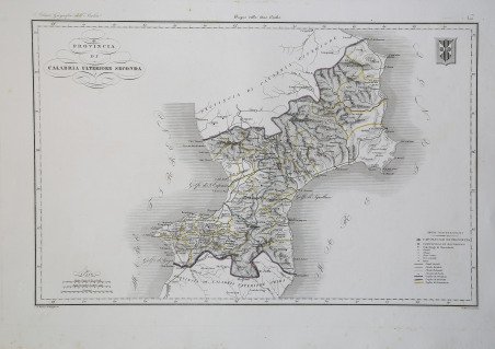 Carta geografica tratta dall’Atlante geografico degli Stati italiani delineato sopra le migliori e più moderne mappe per servire di corredo alla corografia fisica storica e statistica dell'Italia, di Attilio Zuccagni Orlandini ' stampato a Firenze, presso gli editori, 1844. In 2° massimo, 2 voll. Il primo volume contenente le carte dell’Italia Superiore in 52 fogli, il secondo volume quelle dell’Italia Inferiore in 77 fogli. Attilio Zuccagni Orlandini (1784-1872) nacque a Fiesole con il nome di Giuseppe Orlandini. In seguito all’adozione da parte del facoltoso zio materno Attilio Zuccagni (1754-1807), botanico e georgofilo, assunse il nome di Attilio Zuccagni Orlandini. La sua più importante opera è la relazione geografico-cartografica di tutti gli Stati preunitari italiani, la grandiosa ' Corografia fisica, storica e statistica dell’Italia e delle sue Isole ' (Firenze 1835-1845), in dodici volumi per diciannove tomi, con un volume introduttivo sull’intera penisola italiana. L’opera costituì la summa delle centinaia di opere geografiche generali, regionali e locali allora disponibili e presentava, per ogni Stato preunitario, la trattazione fisica, storica, topografica e un inquadramento statistico. Nel 1844-45, la ' Corografia ' fu arricchita con cinque volumi di cartografie, vedute e altre illustrazioni di luoghi e monumenti: ' Atlante geografico degli Stati italiani delineato sopra le migliori e più moderne mappe ' (due volumi con 144 tavole inclusa la grande carta della penisola in 15 fogli) e ' Atlante illustrativo ossia raccolta dei principali monumenti italiani antichi, del medio evo e moderni e di alcune vedute pittoriche ' (tre volumi con 413 illustrazioni, stampate su 269 fogli). Le tavole furono incise, sempre a Firenze, in due apposite officine, da quattro valenti artisti lombardi (Vittorio Angeli, Giacinto Maina, Pietro Manzoni e Giuseppe Pozzi). Soprattutto il primo dei due atlanti rappresenta, ancora oggi, una pietra miliare nella storia della cartografia e dell’iconografia geografica italiana. Fu veramente ‘un’ardua impresa’, dal momento che spesso mancavano ancora (come, ad esempio, per il ' Ducato di Lucca ' e lo ' Stato Pontificio) prodotti cartografici compiutamente geometrici. I due prodotti furono presentati ai Georgofili nel 1843 e nel 1844, insieme alla mappa della Repubblica di San Marino. L’opera si rivelò oltremodo costosa e non ottenne il successo commerciale sperato, ma servì da base per tante altre iniziative editoriali successive che vi attinsero, talora senza neppure rispettarne i diritti d’autore. Incisione in rame, coloritura coeva dei contorni, lievi ossidazioni, per il resto in ottimo stato di conservazione. ' Bibliografia Cfr. Anna Guarducci - ' Dizionario Biografico degli Italiani ' - Volume 100 (2020). Map taken from the ' Atlante geografico degli Stati italiani delineato sopra le migliori e più moderne mappe per servire di corredo alla corografia fisica storica e statistica dell'Italia, di Attilio Zuccagni Orlandini ' printed in Florence, 1844. The first volume contains the maps of Northern Italy in 52 sheets, the second volume those of Southern Italy in 77 sheets. Attilio Zuccagni Orlandini (1784-1872) was born in Fiesole under the name of Giuseppe Orlandini. Following adoption by his wealthy maternal uncle Attilio Zuccagni (1754-1807), a botanist and georgofile, he took the name Attilio Zuccagni Orlandini. ' His most important work is the geographic-cartographic report of all the pre-unification Italian states, the great ' Corografia fisica, storica e statistica dell'Italia e delle sue Isole ' (Florence 1835-1845), in twelve volumes for nineteen tomes, with an introductory volume on the entire Italian peninsula. The work constituted the sum of hundreds of general, regional and local geographic works then available and presented, for each pre-unification state, the physical, historical, topographical and statistical framework. In 1844-45, the Corografia was enriched with five volumes of maps, views and other illustrations of places and monuments: ' Atlante geografico degli Stati italiani delineato sopra le migliori e più moderne mappe ' (two volumes with 144 plates including the large map of the peninsula in 15 sheets) and ' Atlante illustrativo ossia raccolta dei principali monumenti italiani antichi, del medio evo e moderni e di alcune vedute pittoriche ' (three volumes with 413 illustrations, printed on 269 sheets). The plates were engraved, again in Florence, in two special workshops, by four talented Lombard artists (Vittorio Angeli, Giacinto Maina, Pietro Manzoni and Giuseppe Pozzi). ' Especially the first of the two atlases represents, even today, a milestone in the history of cartography and Italian geographic iconography. It was truly 'an arduous undertaking', since cartographic products were often still lacking (as, for example, for the Duchy of Lucca and the Papal States) fully geometric. The two products were presented to the Georgofili in 1843 and 1844, along with the map of the Republic of San Marino. The work proved to be very expensive and did not achieve the commercial success hoped for, but served as a basis for many other subsequent publishing initiatives that drew on it, sometimes without even respecting the copyright. Copperplate with fine outline colour, good condition. ' Literature Anna Guarducci - ' Dizionario Biografico degli Italiani ' - Volume 100 (2020). Cfr.