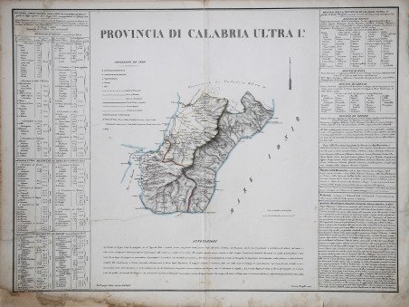 Carta tratta dall’Atlante corografico, storico e statistico del Regno delle Due Sicilie. Napoli: Reale Litografia, 1832. Benedetto Marzolla fu disegnatore topografo e litografo; geografo e cartografo; membro della Commissione di statistica presso il Ministero dell'Interno. Personaggio di grandissimo rilievo nella cartografia napoletana ed italiana del XIX secolo, Marzolla ottenne in vita pubblici riconoscimenti ed attestati per la produzione cartografica di altissima qualità. La sua notorietà si è lentamente dissolta dopo la morte; va tuttavia osservato che solo la mancanza di uno spiccato coinvolgimento politico in senso risorgimentale e di una valenza letteraria nella sua opera non lo hanno reso famoso come i contemporanei Francesco Costantino Marmocchi (1805-1858) e Attilio Zuccagni-Orlandini (1783-1872), con i quali può certamente confrontarsi. I progetti culturali didattici e editoriali di Marzolla furono e rimangono di straordinaria modernità; egli inventò, è il caso di dire, un nuovo modo di intendere e di disegnare la carta geografica, fornendo una visione assolutamente originale della comunicazione dei dati geografici attraverso la combinazione di testo e immagine. Con tale operazione, egli riuscì a fondere in un'unica opera, storia, geografia, economia, statistica e cartografia, raggiungendo un equilibrio grafico di rara efficacia (cfr. V. Valerio, ' Benedetto Marzolla Brindisino, Geografo e Cartografo dell'800 Europeo, Brindisi 2008). Litografia, coloritura coeva dei contorni, restauro conservativo nella parte inferiore destra, per il resto in buono stato di conservazione. Bibliografia Valerio, ' Benedetto Marzolla. Brindisino, Geografo e Cartografo dell’800 Europeo. Carta tratta dall’Atlante corografico, storico e statistico del Regno delle Due Sicilie. Napoli: Reale Litografia, 1832. Benedetto Marzolla fu disegnatore topografo e litografo; geografo e cartografo; membro della Commissione di statistica presso il Ministero dell'Interno. Personaggio di grandissimo rilievo nella cartografia napoletana ed italiana del XIX secolo, Marzolla ottenne in vita pubblici riconoscimenti ed attestati per la produzione cartografica di altissima qualità. La sua notorietà si è lentamente dissolta dopo la morte; va tuttavia osservato che solo la mancanza di uno spiccato coinvolgimento politico in senso risorgimentale e di una valenza letteraria nella sua opera non lo hanno reso famoso come i contemporanei Francesco Costantino Marmocchi (1805-1858) e Attilio Zuccagni-Orlandini (1783-1872), con i quali può certamente confrontarsi. I progetti culturali didattici e editoriali di Marzolla furono e rimangono di straordinaria modernità; egli inventò, è il caso di dire, un nuovo modo di intendere e di disegnare la carta geografica, fornendo una visione assolutamente originale della comunicazione dei dati geografici attraverso la combinazione di testo e immagine. Con tale operazione, egli riuscì a fondere in un'unica opera, storia, geografia, economia, statistica e cartografia, raggiungendo un equilibrio grafico di rara efficacia (cfr. V. Valerio, ' Benedetto Marzolla Brindisino, Geografo e Cartografo dell'800 Europeo, Brindisi 2008). Litografia, coloritura coeva dei contorni, restauro conservativo nella parte inferiore destra, per il resto in buono stato di conservazione. Bibliografia Valerio, ' Benedetto Marzolla. Brindisino, Geografo e Cartografo dell’800 Europeo. Cfr.