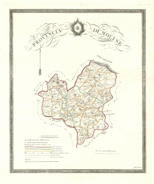 Carta geografica del Molise, confini colorati all'epoca. Vecchio restauro al centro del lato destro