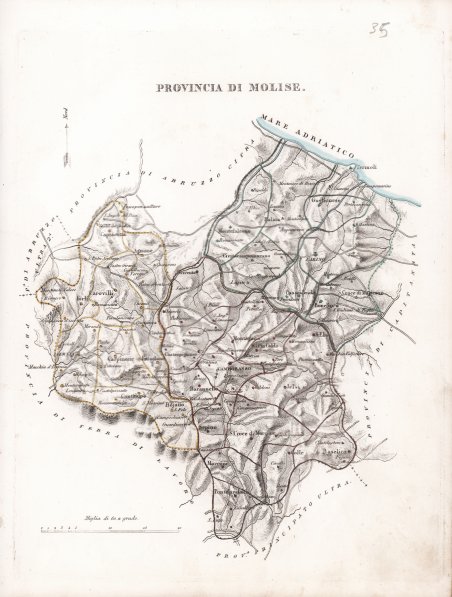 Rarissima carta geografica tratta dall’Atlante Corografico, Statistico, Storico, ed Idrografico del Regno delle Due Sicilie Diviso ne Domini al di qua ed al di la del Faro ' di Giuseppe Bifezzi, stampato a Napoli, Tipografia alla Sibilla, 1836-1845. Si tratta dell’edizione definitiva dell’importane rilievo del geografo calabrese Giuseppe Bifezzi, dedicato alla parte peninsulare del Regno di Napoli. Accanto ' all’Atlante corografico del Regno delle due Sicilie ' di Benedetto Marzolla, questo lavoro costituisce senza dubbio una delle più significative descrizioni regionali del Regno di Napoli della prima metà dell’Ottocento. L'opera uscì a Napoli tra il 1836 e il 1845 in 15 dispense, ciascuna composta di testo e tavole ed è assai rara. Nel 1837 era uscito il ' Nuovo atlante corografico, statistico, storico, ed idrografico del Regno delle Due Sicilie ' che anticipava questa pubblicazione con l’edizione delle sole 18 carte geografiche. Il progetto prevedeva anche una seconda parte riguardante la Sicilia che non fu mai realizzata. Le 15 dispense, ciascuna con frontespizio proprio, riguardano: I. ' Provincia di Napoli, 1843. II. ' Provincia di Terra di lavoro, 1841. III. ' Provincia di Principato citeriore, 1841. IV. ' Basilicata,1843. V. ' Principato ulteriore,1836. VI. ' Capitanata, 1842. VII. ' Terra di Bari, 1839. ' VIII. ' Terra di Otranto, 1841. ' IX. ' Calabria citeriore, 1836. X. ' Calabria ulteriore II, 1839. XI. ' Calabria ulteriore I, 1839. XII. ' Contado di Molise, 1842. XIII. ' Abruzzo citeriore, 1837. XIV. ' Abruzzo ultra secondo, ' 1838. XV. ' Abruzzo ulteriore primo, 1841. Il volume è illustrato da una carta geografica generale del Regno di Napoli, 2 tavole con raffigurati i laghi principali del Regno, 15 carte geografiche con i confini acquerellati, corrispondenti alle 15 province, 16 vedute: Napoli, Caserta, Capua, Salerno, Potenza, Avellino, Foggia, Bari, Lecce, Cosenza, Catanzaro, Reggio Calabria, Campobasso, Chieti, Aquila, Teramo e 16 tavole di costumi delle diverse province. Le vedute e i costumi sono litografie di Giuseppe D’Onofrio da disegni di Francesco Wenzel. Giuseppe Bifezzi, inventore e cartografo calabrese, era nato il 12 settembre del 1798 a Serra San Bruno. Ingegnere, geografo, litografo, capitano dell’esercito borbonico, componente del Real Officio Topografico, inventore di uno strumento per la misurazione delle distanze - il telegometro – che, ancor più che l’opera geografica e cartografica, fu decisivo per consolidare la fama di Bifezzi tra i suoi contemporanei. Della sua invenzione Bifezzi aveva fornito accurati ragguagli in una pubblicazione in-folio, corredata da disegni illustrativi, stampata a Napoli nel 1848 presso la Real Tipografia Militare, che si apriva con una Memoria dell’autore sul suo lavoro. L’invenzione del telegometro nasceva, secondo l’esordio della predetta Memoria, dalla consapevolezza che se la misura delle distanze orizzontali risultava essenziale nei rilievi topografici, altrettanto “difficile, lungo, ed inesatto” era il metodo del tempo per ottenerla. Il telegometro, come ricorda anche la scheda dell’Istituto Geografico Militare che ne ospita a Firenze nel Museo degli strumenti un esemplare, comparve nella Grande Esposizione di Londra, promossa dalla Royal Society of Arts, nel 1862 e venne presentato successivamente pure nell’Esposizione internazionale marittima di Napoli del 1871, insieme con due altri congegni (il telescopometro e il pantelemetro). Acquaforte, coloritura coeva dei contorni, minime fioriture della carta, in ottimo stato di conservazione. Bibliografia: V. Valerio, ' Atlanti napoletani del XIX sec. (1808-1869), scheda 25, pp. 92-94; Cremonini, 316. Very rare map from the ' Atlante Corografico, Statistico, Storico, ed Idrografico del Regno delle Due Sicilie Diviso ne Domini al di qua ed al di la del Faro ' by Giuseppe Bifezzi, printed in Naples, Tipografia alla Sibilla, 1836-1845. This is the definitive edition of Calabrian geographer Giuseppe Bifezzi's important survey of the peninsular part of the Kingdom of Naples. Next to Benedetto Marzolla's ' Chorographic Atlas of the Kingdom of the Two Sicilies, this work undoubtedly constitutes one of the most significant regional descriptions of the Kingdom of Naples in the first half of the 19th century. The work came out in Naples between 1836 and 1845 in 15 dispensations, each consisting of text and plates, and is very rare. In 1837 the ' Nuovo atlante corografico, statistico, storico, ed idrografico del Regno delle Due Sicilie ' had come out, anticipating this publication by publishing only 18 maps. The project also included a second part concerning Sicily, which was never realized. The volume is illustrated by a general map of the Kingdom of Naples, 2 plates depicting the main lakes of the Kingdom, 15 maps with watercolor borders, corresponding to the 15 provinces, 16 views: Naples, Caserta, Capua, Salerno, Potenza, Avellino, Foggia, Bari, Lecce, Cosenza, Catanzaro, Reggio Calabria, Campobasso, Chieti, Aquila, Teramo, and 16 plates of costumes of the different provinces. The views and costumes are lithographs by Giuseppe D'Onofrio from drawings by Francesco Wenzel. ' Giuseppe Bifezzi, Calabrian inventor and cartographer, was born Sept. 12, 1798, in Serra San Bruno. Engineer, geographer, lithographer, captain in the Borboni army, member of the ' Royal Topographical Office, inventor of an instrument for measuring distances-the telegometer-that, even more than his geographic and cartographic work, was decisive in consolidating Bifezzi's fame among his contemporaries. Of his invention Bifezzi had provided accurate details in an in-folio publication, accompanied by illustrative drawings, printed in Naples in 1848 at the Real Tipografia Militare, which opened with a Memoir by the author on his work. The invention of the telegometer stemmed, according to the beginning of the aforementioned Memoir, from the realization that while the measur