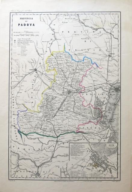 Tratta dall' “Atlante Geografico dell'Italia” Milano, Francesco Vallardi, 1880 circa. Incisione, b/n (confini in colore d'epoca), cm 33,3 x 50,2 (la parte figurata) più margini. In basso, entro riquadro, la piantina di Este. Carta con i margini un poco rifilati ma buon esemplare.