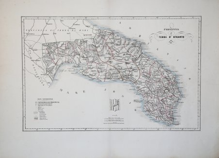 Sconosciuta carta geografica della regione realizzata a Napoli dalla litografia di Filippo Cirelli. Si basa sulla carta geografica pubblicata da Attilio Zuccagni Orlandini (1784-1872) nel 1844 a Firenze. https://www.antiquarius.it/it/puglia/12704-provincia-di-terra-d-otranto.html Appartiene ad un “corpus” di carte del Regno di Napoli (2 generali e 10 raffiguranti 10 delle 14 province del Regno) che dovevano probabilmente costituire un mai pubblicato “Atlante” del Regno. Le due carte generali e quella della Calabria ulteriore sono firmate ' Lit. Cirelli. Sono sconosciute a tutti i repertori bibliografici; non compaiono in nessuna delle pubblicazioni sulla cartografia napoletana dell’800 di Vladimiro Valerio, che ci ha personalmente confermato di non conoscerle. È mia opinione, che le carte fossero destinate per illustrare ed integrare la più monumentale opera del Cirelli, ' Il Regno delle Due Sicilie descritto ed illustrato, una storia dell’umanità vista attraverso le tradizioni, le abitudini, gli usi e i costumi degli abitanti, «sussidiata» da re Ferdinando II, che avrebbe dovuto illustrare ogni singolo paese del Regno. Essa, iniziata nel 1853 e pubblicata a fascicoli rimase incompiuta per la morte di Cirelli e forse anche per la fine del Regno delle Due Sicilie e di Ferdinando II. Opinione condivisa dallo studioso di Filippo Cirelli, il prof. Giuseppe Pignatelli, che ci ha segnalato, come ' nella corrispondenza riguardante la pubblicazione del ' Il Regno delle Due Sicilie descritto ed illustrato ' pubblicata sul ' Poliorama Pittoresco, in una lettera di Leopoldo Pagano al Cirelli del 1854 si suggerisce di allegare all'opera “una carta corografica ogni tre mesi”. Secondo Pignatelli “un’altra ipotesi, più peregrina rispetto alla prima, potrebbe associare le cartografie a qualche incarico su commissione, consuetudine non secondaria del Cirelli soprattutto negli ultimi anni di attività quando ‘esplode’ letteralmente la mania editoriale per gli atlanti geografici”. Se le 10 carte delle province sono tutte di evidente derivazione da Zuccagni Orlandini, le due carte del Regno (firmate anche ' Lit. Steeger) appaiono come prodotti “originali” - per quanto possibile in un’epoca in cui le numerose tipografie rivali erano uso copiarsi l’una dall’altra. Il confronto con le carte delle provincie del Regno di Zuccagni Orlandini con le 10 in nostro possesso (Abruzzo Citeriore, Terra di Lavoro, Principato Ulteriore, Principato Citeriore, Molise, Basilicata, Terra di Bari, Terra d’Otranto, Calabria Citeriore e Calabria Ulteriore prima) ci indica la mancanza delle due sull’Abruzzo (Ulteriore primo e secondo), di quella della Capitanata e di quella della Calabria Ulteriore seconda. Ma, per quanto ipotizzato prima, queste carte potrebbero non essere mai state realizzate. Per la datazione delle carte, la derivazione da Zuccagni Orlandini ci fornisce un ' terminus post quem ' del 1844; la lettera di Leopoldo Pagano sposta la datazione a dopo il 1854, mentre la presenza nel corpus della carta del ' Regno delle Due Sicilie ' le data a prima del 1860. https://www.antiquarius.it/it/italia-meridionale/13954-reali-dominj-al-di-qua-del-faro-nel-regno-delle-due-sicilie.html Come già accennato le 2 carte del Regno sono firmate anche da Vittorio Steeger, un modesto editore litografo attivo a Napoli nella seconda metà del XIX secolo, assieme al figlio Giuseppe. Non è chiaro il motivo di tale collaborazione. Filippo Cirelli, figura poliedrica di inventore ed editore, elaborò una raffinata elaborazione della scoperta di Moritz Hermann Von Jacobi, la galvanoplastica, che ha come fine la riproduzione di disegni mediante matrici grafiche: ' ideò la «galvanotipia», o «elettrotipia», per la cui scoperta c’è l’encomio ed una speciale menzione da parte dell’Istituto di Francia, una citazione «con onore» nel ' Nuovo Dizionario Tecnologico, edito a Venezia, ci sono elogi da parte della stampa. Sconosciuta carta geografica della regione realizzata a Napoli dalla litografia di Filippo Cirelli. Si basa sulla carta geografica pubblicata da Attilio Zuccagni Orlandini (1784-1872) nel 1844 a Firenze. https://www.antiquarius.it/it/puglia/12704-provincia-di-terra-d-otranto.html Appartiene ad un “corpus” di carte del Regno di Napoli (2 generali e 10 raffiguranti 10 delle 14 provincie del Regno) che dovevano probabilmente costituire un mai pubblicato “Atlante” del Regno. Le due carte generali e quella della Calabria ulteriore sono firmate ' Lit. Cirelli. Sono sconosciute a tutti i repertori bibliografici; non compaiono in nessuna delle pubblicazioni sulla cartografia napoletana dell’800 di Vladimiro Valerio, che ci ha personalmente confermato di non conoscerle. È mia opinione, che le carte fossero destinate per illustrare ed integrare la più monumentale opera del Cirelli, ' Il Regno delle Due Sicilie descritto ed illustrato, una storia dell’umanità vista attraverso le tradizioni, le abitudini, gli usi e i costumi degli abitanti, «sussidiata» da re Ferdinando II, che avrebbe dovuto illustrare ogni singolo paese del Regno. Essa, iniziata nel 1853 e pubblicata a fascicoli rimase incompiuta per la morte di Cirelli e forse anche per la fine del Regno delle Due Sicilie e di Ferdinando II. Opinione condivisa dallo studioso di Filippo Cirelli, il prof. Giuseppe Pignatelli, che ci ha segnalato, come ' nella corrispondenza riguardante la pubblicazione del ' Il Regno delle Due Sicilie descritto ed illustrato ' pubblicata sul ' Poliorama Pittoresco, in una lettera di Leopoldo Pagano al Cirelli del 1854 si suggerisce di allegare all'opera “una carta corografica ogni tre mesi”. Secondo Pignatelli “un’altra ipotesi, più peregrina rispetto alla prima, potrebbe associare le cartografie a qualche incarico su commissione, consuetudine non secondaria del Cirelli soprattutto negli ultimi anni di attività quando ‘esplode’ letteralmente la mania editoriale per gli atlan