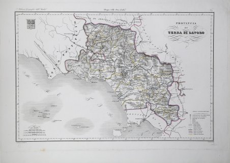 Carta geografica tratta dallâAtlante geografico degli Stati italiani delineato sopra le migliori e più moderne mappe per servire di corredo alla corografia fisica storica e statistica dell'Italia, di Attilio Zuccagni Orlandini stampato a Firenze, presso gli editori, 1844. In 2° massimo, 2 voll. Il primo volume contenente le carte dellâItalia Superiore in 52 fogli, il secondo volume quelle dellâItalia Inferiore in 77 fogli. Attilio Zuccagni Orlandini (1784-1872) nacque a Fiesole con il nome di Giuseppe Orlandini. In seguito allâadozione da parte del facoltoso zio materno Attilio Zuccagni (1754-1807), botanico e georgofilo, assunse il nome di Attilio Zuccagni Orlandini. La sua più importante opera è la relazione geografico-cartografica di tutti gli Stati preunitari italiani, la grandiosa Corografia fisica, storica e statistica dellâItalia e delle sue Isole (Firenze 1835-1845), in dodici volumi per diciannove tomi, con un volume introduttivo sullâintera penisola italiana. Lâopera costituì la summa delle centinaia di opere geografiche generali, regionali e locali allora disponibili e presentava, per ogni Stato preunitario, la trattazione fisica, storica, topografica e un inquadramento statistico. Nel 1844-45, la Corografia fu arricchita con cinque volumi di cartografie, vedute e altre illustrazioni di luoghi e monumenti: Atlante geografico degli Stati italiani delineato sopra le migliori e più moderne mappe (due volumi con 144 tavole inclusa la grande carta della penisola in 15 fogli) e Atlante illustrativo ossia raccolta dei principali monumenti italiani antichi, del medio evo e moderni e di alcune vedute pittoriche (tre volumi con 413 illustrazioni, stampate su 269 fogli). Le tavole furono incise, sempre a Firenze, in due apposite officine, da quattro valenti artisti lombardi (Vittorio Angeli, Giacinto Maina, Pietro Manzoni e Giuseppe Pozzi). Soprattutto il primo dei due atlanti rappresenta, ancora oggi, una pietra miliare nella storia della cartografia e dellâiconografia geografica italiana. Fu veramente âunâardua impresaâ, dal momento che spesso mancavano ancora (come, ad esempio, per il Ducato di Lucca e lo Stato Pontificio) prodotti cartografici compiutamente geometrici. I due prodotti furono presentati ai Georgofili nel 1843 e nel 1844, insieme alla mappa della Repubblica di San Marino. Lâopera si rivelò oltremodo costosa e non ottenne il successo commerciale sperato, ma servì da base per tante altre iniziative editoriali successive che vi attinsero, talora senza neppure rispettarne i diritti dâautore. Incisione in rame, coloritura coeva dei contorni, lievi ossidazioni, per il resto in ottimo stato di conservazione. Bibliografia Cfr. Anna Guarducci - Dizionario Biografico degli Italiani - Volume 100 (2020).