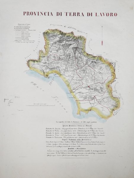 Rara carta geografica disegnata da Luigi De Salvatori per l’editore Antonio Zezon. La carta è pubblicata in ' Atlante Corografico della Sicilia corredato di alcune notizie statistiche, Napoli Nella Litografia Zezon [s. d. 1832. Si tratta di un piccolo atlante allestito dall'editore napoletano Antonio Zezon (1803-1881). L'impianto, il contenuto e la dimensione sono gli stessi dell'analoga raccolta di carte relative al regno di Napoli, pubblicate da Antonio Zezon intorno al 1831-32 e successivamente inserite nella sua ' Storia del Regno di Napoli dalla fondazione della Monarchia infino al 19° secolo, ' edita a Napoli nel 1838. Autore delle carte è il disegnatore dell'Officio Topografico Luigi De Salvatori (1807-post 1867), che firma quasi tutte le carte del regno di Napoli e le due mappe del ' Valle Minore di Siracusa ' e del ' Valle Minore di Trapani. ' Intorno al 1830 De Salvatori lavorava nell'Officio Topografico dove era entrato come alunno proprietario il 21 novembre 1823. Nel 1827 aveva lavorato al disegno della pianta dei quartieri di Napoli, lavoro delicato e attribuito ai migliori disegnatori dell'Officio. Famosa divenne la sua scuola di calligrafia ricordata da Bruno nell'Osservatore di Napoli ' (1855:518). Litografia, con coloritura dei contorni, in ottimo stato di conservazione. Rare map drawn by Luigi De Salvatori for the publisher Antonio Zezon. The map is published in Atlante Corografico della Sicilia corredato di alcune notizie statistiche, Napoli Nella Litografia Zezon [s. d. 1832. This is a small atlas set up by the Neapolitan publisher Antonio Zezon (1803-1881). The layout, content and size are the same as the similar collection of maps relating to the kingdom of Naples, published by Antonio Zezon around 1831-32 and later included in his Storia del Regno di Napoli dalla fondazione della Monarchia infino al 19° secolo, published in Naples in 1838. The author of the maps is Officio Topografico draftsman Luigi De Salvatori (1807-post 1867), who signed almost all the maps of the Kingdom of Naples and the two maps of the Valle Minore di Siracusa and Valle Minore di Trapani. Around 1830 De Salvatori was working in the Officio Topografico where he had entered as a proprietary pupil on November 21, 1823. In 1827 he had worked on the drawing of the plan of the districts of Naples, delicate work attributed to the best draftsmen in the Officio. Lithograph, with outline coloring, in excellent condition. Cfr.