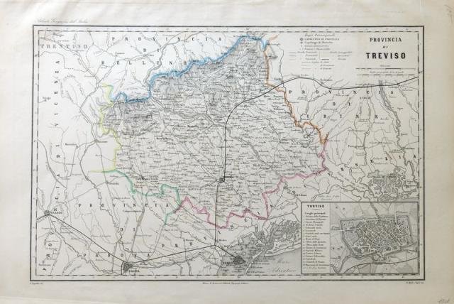 Tratta dall' “Atlante Geografico dell'Italia” Milano, Francesco Vallardi, 1880 circa. Incisione, b/n (confini in colore d'epoca), cm 32,5 x 49,8 (la parte figurata) più margini. In basso, entro riquadro, la piantina di Treviso. Buon esemplare.