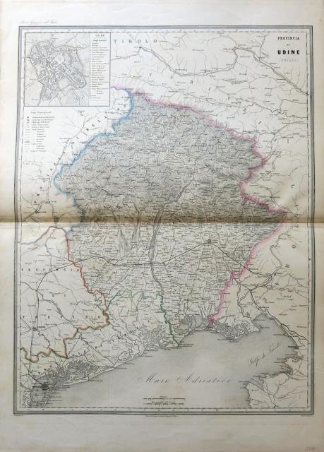 Tratta dall' “Atlante Geografico dell'Italia” Milano, Francesco Vallardi, 1880 circa. Incisione a doppia pagina, b/n (confini in colore d'epoca), cm 52,3 x 69,2 (la parte figurata) più margini. In alto, entro riquadro, la piantina di Udine. Ingiallimento della brachetta centrale, peraltro buon esemplare.