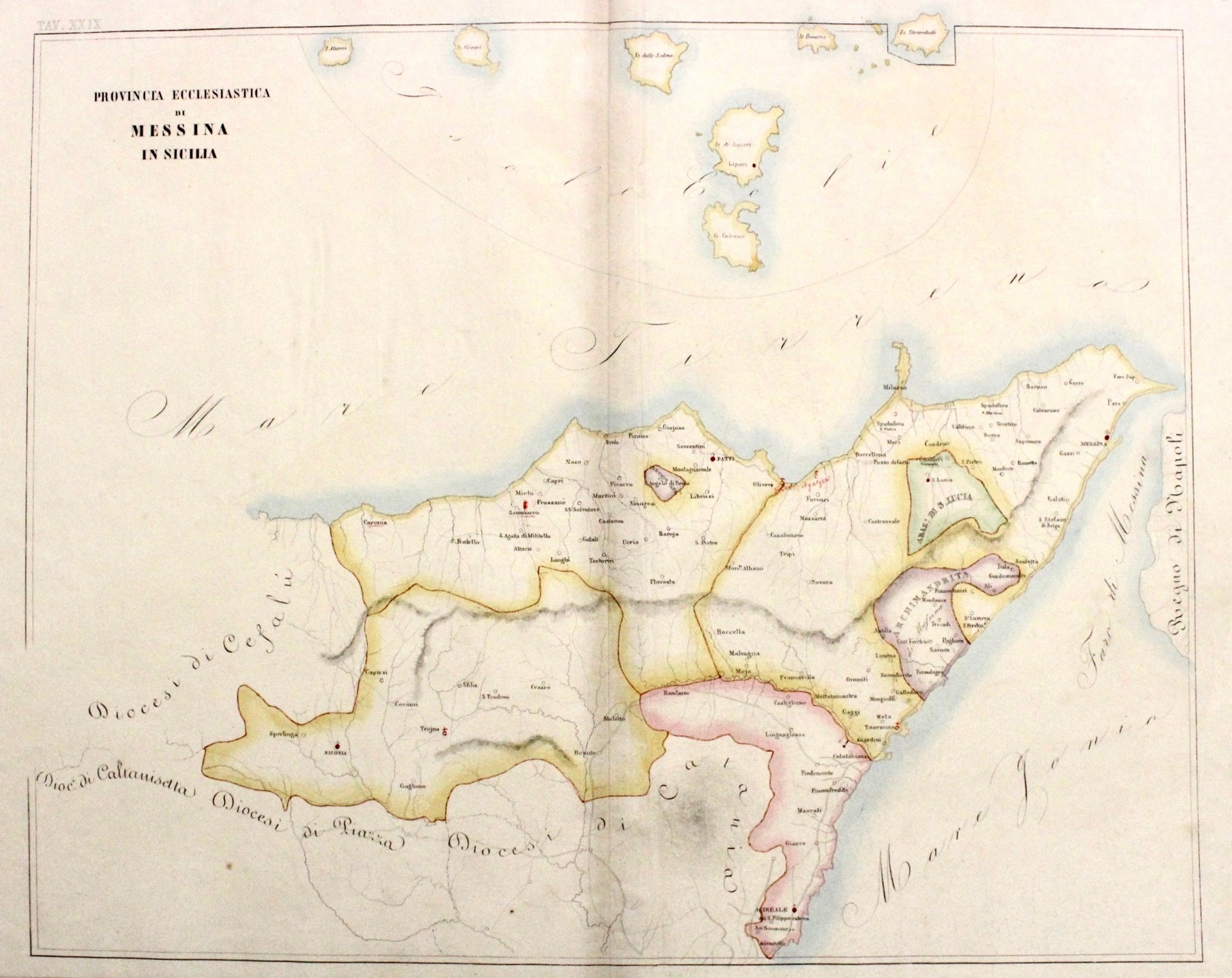 Incisione in rame al tratto, dipinta a mano d’epoca ad acquerello, mm 470x585. Rara carta geografica della Sicilia orientale con le isole Lipari (Eolie) proveniente da "L'Orbe Cattolico ossia Atlante Geografico Storico Ecclesiastico Opera del Commendatore Girolamo Petri Officiale minutante della segreteria di Stato". In perfette condizioni.