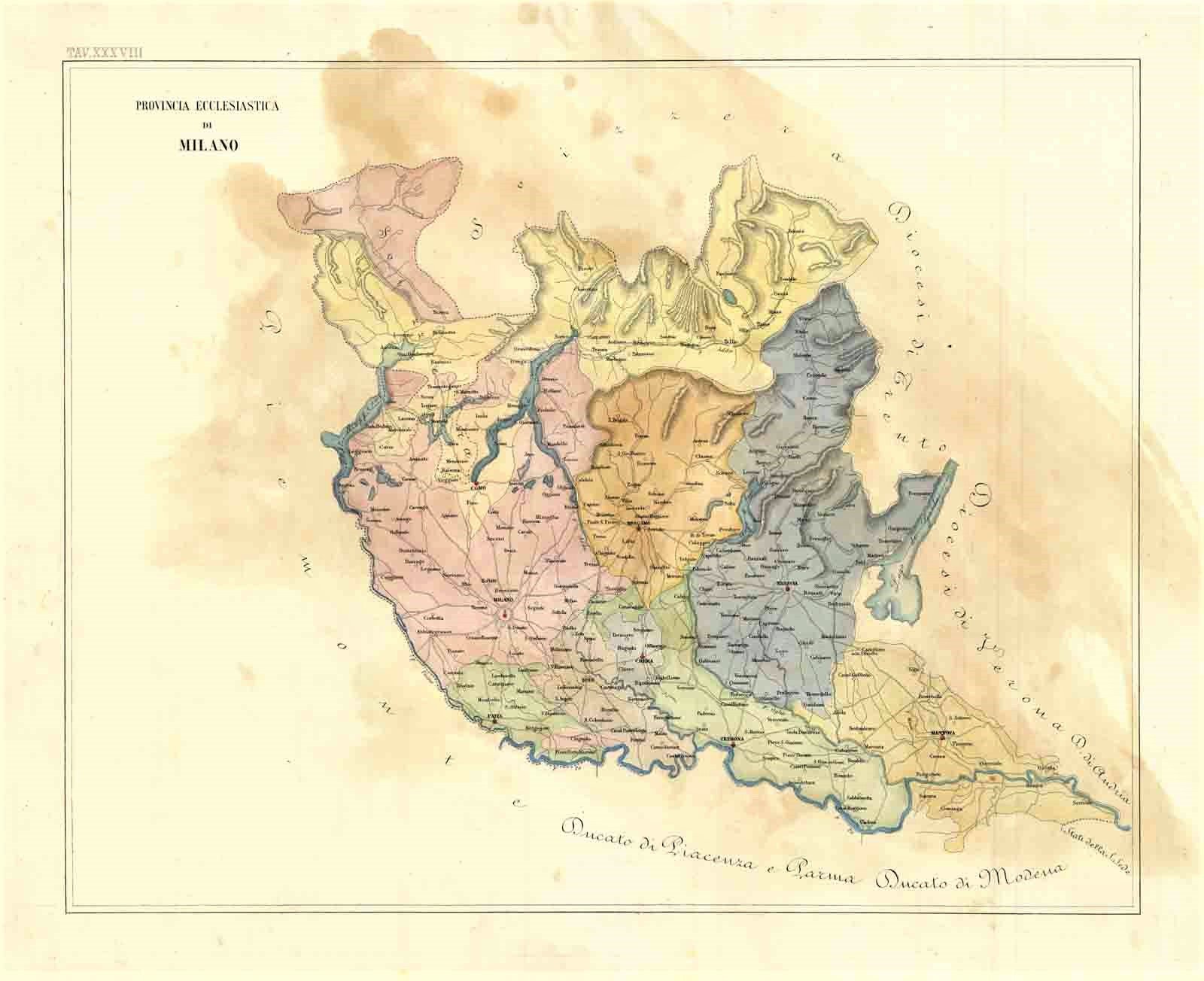 Carta della provincia ecclesiastica di Milano in coloritura coeva. Alcuni segni del tempo