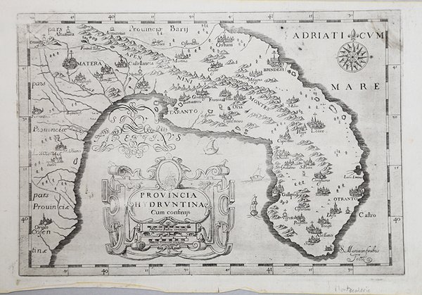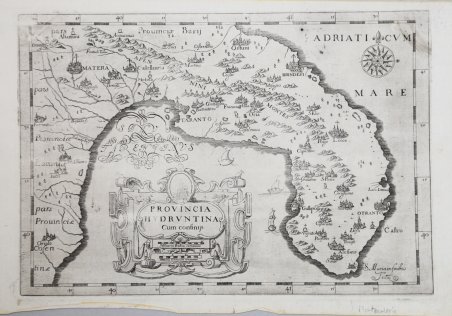Carta geografica tratta dalla “Chorographica Descriptio Provinciarum et Conventum.”, atlante dell'ordine dei frati cappucini. L'atlante delle province cappuccine era stato iniziato in forma manoscritta dal ministro generale dell'ordine, padre Silvestro da Panicale nel 1632 e doveva servire da sussidio geografico per le visite generali. Alla sua morte il successore Padre Giovanni di Montecaliero, al quale spesso viene erroneamente attribuita la paternità delle carte, incaricò padre Massimino da Guechen di proseguire l'opera. Gli incisori delle lastre furono appunto Massimino da Guechen, Bernardino Burdigalensis e Ludovico Monteregali. L'atlante ebbe una prima edizione nel 1643 a Roma con un totale di 46 mappe (23 per l'Italia, 5 per la Spagna, 11 sulla Francia e 7 per la Germania), quindi ristampata nel 1646 ancora nella Città Eterna (Romae, et Taurini) con un numero di tavole accresciuto alle 51 definitive, compresa la grande carta geografica più volte ripiegata dell'Europa.Venne ristampata a Torino nel 1649, sumptibus Alexandri Federici Cauallerij sempre con le 51 carte geografiche definitive (l'Europa, 24 carte per l'Italia, 6 per la Spagna, 12 per la Francia e 8 per i territori dell'Impero). Infine si replicò a Torino per i torchi di Alessandro Federico Cavalleri un'ultima volta nel 1654 con le medesime carte presenti nella precedente pubblicazione. L'opera mostrava visivamente la diffusione dell'ordine, infatti le diverse carte dell'atlante, che rappresentano nazioni e province, offrono per ognuna di esse la statistica completa dei conventi. Incisione in rame, lievissima gora d'acqua, per il resto in ottimo stato di conservazione. Rara. Taken from the “Chorographica Descriptio Provinciaru & Conventum F. F. Minorum S. Francisci Capucinorum.”.The atlas of the Capuchin provinces was initiated in manuscript form by the minister general of the order, Father Silvestro from Panicale in 1632 and was to serve as an aid for geographic General visits. At his death, the successor Father Giovanni from Montecaliero, which is often mistakenly attributed the authorship of maps, commissioned by his father Massimino Guechen to continue the work. The engravers of the plates were executed by Massimino from Guechen, Bernardino Burdigalensis and Ludovico Monteregali. The first edition was printed in Rome in 1643, the second in Turin in 1649 and then in 1654 and finally released in 1712, another convention attribute maps to Montecalerio. The work showed visually the spread of the order, in fact the different maps of the atlas, which represent nations and provinces, to offer each of them the full statistical convents.Copperplate, very good condition. Rare. Cfr.
