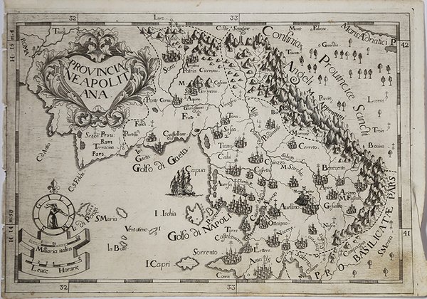 Carta geografica tratta dalla “Chorographica Descriptio Provinciarum et Conventum.”, atlante dell'ordine dei frati cappucini. Si tratta della nuova edizione dell'atlante delle province cappuccine, iniziato in forma manoscritta dal ministro generale dell'ordine, padre Silvestro da Panicale nel 1632, e che doveva servire da sussidio geografico per le visite generali. Alla sua morte il successore Padre Giovanni di Montecaliero, al quale spesso viene erroneamente attribuita la paternità delle carte, incaricò padre Massimino da Guechen di proseguire l'opera, edita per la prima volta a Roma nel 1643.A commissionare a Giovanni Battista da Cassine la Chorographica descriptio Provinciarum, et Conventuum FF. Min. S. Francisci Capucinorum fu Agostino da Latisana, 34° Ministro Generale dei cappuccini dal 1702 fino al 1709. Nell'estate di nove anni dopo, l'attento lavoro di rettifica ed aggiornamento era concluso e, retrodatando l'atlante al 1712, lo si poté stampare nel 1713 a Milano.L'opera conta 62 carte geografiche incise in rame. Vi sono raffigurate un'Europa, tra le poche mappe che rechi una data -il 1710- essendoci il 1711 per le altre datate, la Spagna con 7 carte, la Francia con 13, l'Italia con 26 carte geografiche, l'Impero con 15 fogli.L'opera mostrava visivamente la diffusione dell'ordine, infatti le diverse carte dell'atlante, che rappresentano nazioni e province, offrono per ognuna di esse la statistica completa dei conventi. Questa edizione definitiva del 1712 presenta le carte totalmente differenti, aggiornate ed arricchite. Incisione in rame, in ottimo stato di conservazione. Carta geografica tratta dalla “Chorographica Descriptio Provinciarum et Conventum.”, atlante dell'ordine dei frati cappucini. Si tratta della nuova edizione dell'atlante delle province cappuccine, iniziato in forma manoscritta dal ministro generale dell'ordine, padre Silvestro da Panicale nel 1632, e che doveva servire da sussidio geografico per le visite generali. Alla sua morte il successore Padre Giovanni di Montecaliero, al quale spesso viene erroneamente attribuita la paternità delle carte, incaricò padre Massimino da Guechen di proseguire l'opera, edita per la prima volta a Roma nel 1643.A commissionare a Giovanni Battista da Cassine la Chorographica descriptio Provinciarum, et Conventuum FF. Min. S. Francisci Capucinorum fu Agostino da Latisana, 34° Ministro Generale dei cappuccini dal 1702 fino al 1709. Nell'estate di nove anni dopo, l'attento lavoro di rettifica ed aggiornamento era concluso e, retrodatando l'atlante al 1712, lo si poté stampare nel 1713 a Milano.L'opera conta 62 carte geografiche incise in rame. Vi sono raffigurate un'Europa, tra le poche mappe che rechi una data -il 1710- essendoci il 1711 per le altre datate, la Spagna con 7 carte, la Francia con 13, l'Italia con 26 carte geografiche, l'Impero con 15 fogli.L'opera mostrava visivamente la diffusione dell'ordine, infatti le diverse carte dell'atlante, che rappresentano nazioni e province, offrono per ognuna di esse la statistica completa dei conventi. Questa edizione definitiva del 1712 presenta le carte totalmente differenti, aggiornate ed arricchite. Incisione in rame, in ottimo stato di conservazione. Cfr.