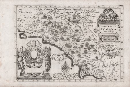 Carta geografica tratta dalla “Chorographica Descriptio Provinciarum et Conventum.”, atlante dell'ordine dei frati cappucini.L'atlante delle province cappuccine era stato iniziato in forma manoscritta dal ministro generale dell'ordine, padre Silvestro da Panicale nel 1632 e doveva servire da sussidio geografico per le visite generali. Alla sua morte il successore Padre Giovanni di Montecaliero, al quale spesso viene erroneamente attribuita la paternità delle carte, incaricò padre Massimino da Guechen di proseguire l'opera. Gli incisori delle lastre furono appunto Massimino da Guechen, Bernardino Burdigalensis e Ludovico Monteregali.L'atlante ebbe una prima edizione nel 1643 a Roma con un totale di 46 mappe (23 per l'Italia, 5 per la Spagna, 11 sulla Francia e 7 per la Germania), quindi ristampata nel 1646 ancora nella Città Eterna (Romae, et Taurini) con un numero di tavole accresciuto alle 51 definitive, compresa la grande carta geografica più volte ripiegata dell'Europa.Venne ristampata a Torino nel 1649, sumptibus Alexandri Federici Cauallerij sempre con le 51 carte geografiche definitive (l'Europa, 24 carte per l'Italia, 6 per la Spagna, 12 per la Francia e 8 per i territori dell'Impero). Infine si replicò a Torino per i torchi di Alessandro Federico Cavalleri un'ultima volta nel 1654 con le medesime carte presenti nella precedente pubblicazione.L'opera mostrava visivamente la diffusione dell'ordine, infatti le diverse carte dell'atlante, che rappresentano nazioni e province, offrono per ognuna di esse la statistica completa dei conventi.Incisione in rame in ottimo stato di conservazione. Rara. Taken from the “Chorographica Descriptio Provinciaru & Conventum F. F. Minorum S. Francisci Capucinorum.”.The atlas of the Capuchin provinces was initiated in manuscript form by the minister general of the order, Father Silvestro from Panicale in 1632 and was to serve as an aid for geographic General visits.At his death, the successor Father Giovanni from Montecaliero, which is often mistakenly attributed the authorship of maps, commissioned by his father Massimino Guechen to continue the work.The engravers of the plates were executed by Massimino from Guechen, Bernardino Burdigalensis and Ludovico Monteregali.The first edition was printed in Rome in 1643, the second in Turin in 1649 and then in 1654 and finally released in 1712, another convention attribute maps to Montecalerio.The work showed visually the spread of the order, in fact the different maps of the atlas, which represent nations and provinces, to offer each of them the full statistical convents.Copperplate, very good condition. Rare. Cfr.