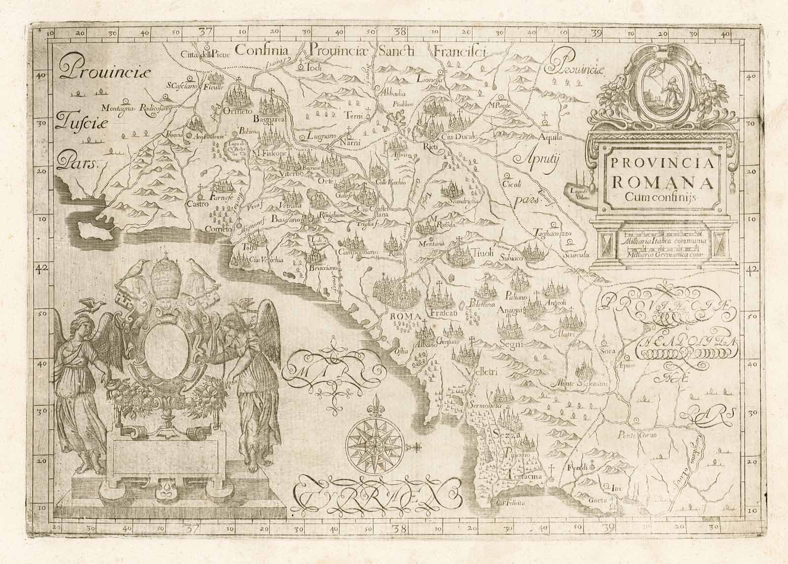 Carta geografica del territorio della provincia romana cappuccina comprendente quasi per intero il Lazio. In questa carta sono raffigurati con vedute prospettiche di fantasia tutti i centri in cui si trova il convento dell'Odine. Margine graduato su tutto il perimetro. Alla carta è allegato un foglio con ricca cornice incisa anch'essa su lastra di rame in ove si riassumono i luoghi in cui i frati erano presenti nella provincia