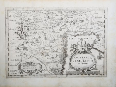 Carta geografica tratta dalla “Chorographica Descriptio Provinciarum et Conventum.”, atlante dell'ordine dei frati cappucini. L'atlante delle province cappuccine era stato iniziato in forma manoscritta dal ministro generale dell'ordine, padre Silvestro da Panicale nel 1632 e doveva servire da sussidio geografico per le visite generali. Alla sua morte il successore Padre Giovanni di Montecaliero, al quale spesso viene erroneamente attribuita la paternità delle carte, incaricò padre Massimino da Guechen di proseguire l'opera. Gli incisori delle lastre furono appunto Massimino da Guechen, Bernardino Burdigalensis e Ludovico Monteregali. L'atlante ebbe una prima edizione nel 1643 a Roma con un totale di 46 mappe (23 per l'Italia, 5 per la Spagna, 11 sulla Francia e 7 per la Germania), quindi ristampata nel 1646 ancora nella Città Eterna (Romae, et Taurini) con un numero di tavole accresciuto alle 51 definitive, compresa la grande carta geografica più volte ripiegata dell'Europa.Venne ristampata a Torino nel 1649, sumptibus Alexandri Federici Cauallerij sempre con le 51 carte geografiche definitive (l'Europa, 24 carte per l'Italia, 6 per la Spagna, 12 per la Francia e 8 per i territori dell'Impero). Infine si replicò a Torino per i torchi di Alessandro Federico Cavalleri un'ultima volta nel 1654 con le medesime carte presenti nella precedente pubblicazione. L'opera mostrava visivamente la diffusione dell'ordine, infatti le diverse carte dell'atlante, che rappresentano nazioni e province, offrono per ognuna di esse la statistica completa dei conventi. Incisione in rame in ottimo stato di conservazione. Rara. //// Taken from the “Chorographica Descriptio Provinciaru & Conventum F. F. Minorum S. Francisci Capucinorum.”.The atlas of the Capuchin provinces was initiated in manuscript form by the minister general of the order, Father Silvestro from Panicale in 1632 and was to serve as an aid for geographic General visits. At his death, the successor Father Giovanni from Montecaliero, which is often mistakenly attributed the authorship of maps, commissioned by his father Massimino Guechen to continue the work. The engravers of the plates were executed by Massimino from Guechen, Bernardino Burdigalensis and Ludovico Monteregali. The first edition was printed in Rome in 1643, the second in Turin in 1649 and then in 1654 and finally released in 1712, another convention attribute maps to Montecalerio. The work showed visually the spread of the order, in fact the different maps of the atlas, which represent nations and provinces, to offer each of them the full statistical convents.Copperplate, very good condition. Rare.