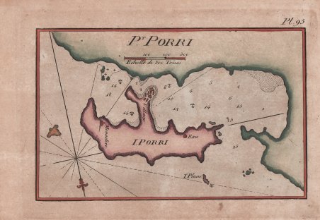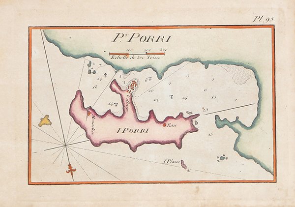 Piano nautico tratto dal " Recueil des principaux plans des ports & rades de la Méditerranée" di Josepgh Roux, pubblicato per la prima volta a Marsiglia nel 1764 e successivamente ristampato - ampliato - a Genova da Yves Gravier con il titolo "Recueil de 163 principaux plans des ports et rades de la Mediterranée" (1804).Ulteriore edizione dell'opera, con il titolo "Plans des ports ed des rades de la Mer Méditerranée." è stampata a Livorno da Carlo Tesi nel 1858. Incisione in rame, finemente acquarellata a mano, in ottimo stato di conservazione. First published in the "Recueil des principaux plans des ports et rades de la Mer Mediterranee", 1764, this nice nautical chart is taken from the rare "Plans des ports ed des rades de la Mer Méditerranée." published in Leghorn by Carlo Tesi, 1858. Copperplate with fine colouring, in very good condition. Cfr.