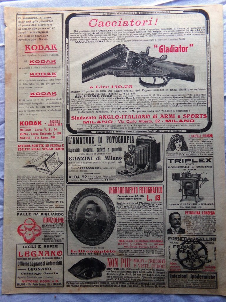 Pubblicità del 1911 Cacciatori Gladiator Triplex Cucine Legnano Kodak Petrolina