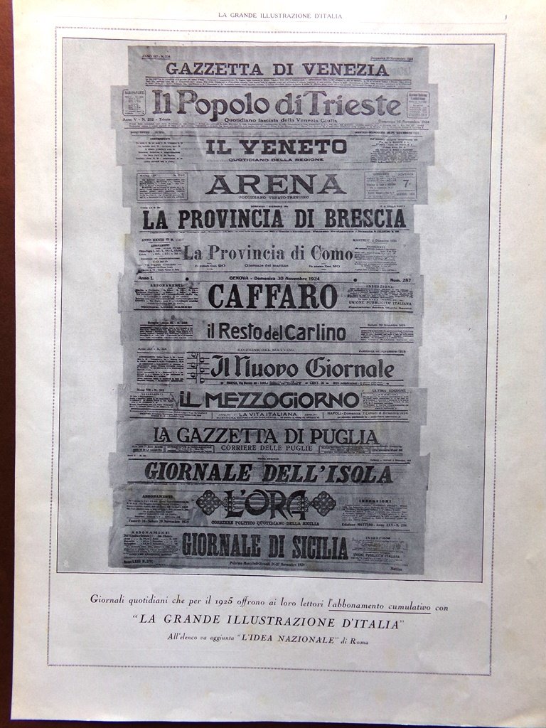 Giornali quotidiani del 1925 che offrono l'abbonamento cumulativo con "La grande illustrazione d'Italia"